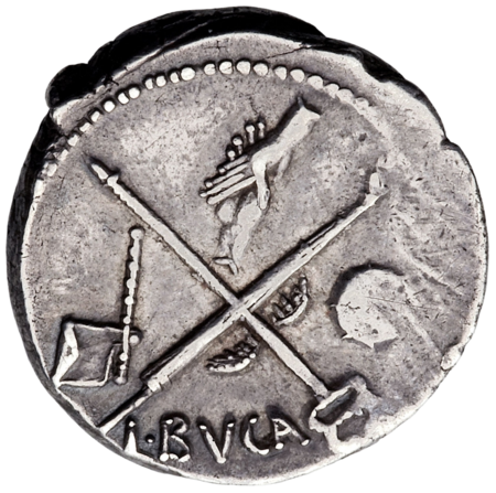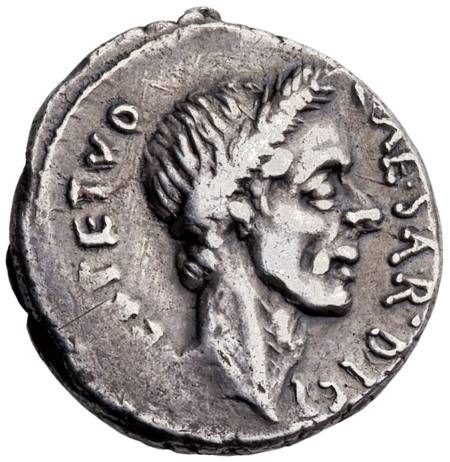 Изображение Юлия Цезаря (слева), увенчанное лавровым венком, по контуру начертана легенда CAESAR•DICT PERPETVO — «Цезарь, пожизненный диктатор».
