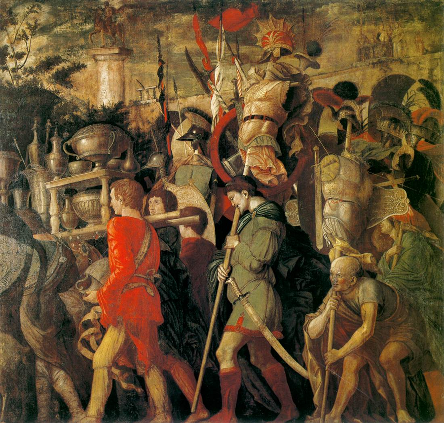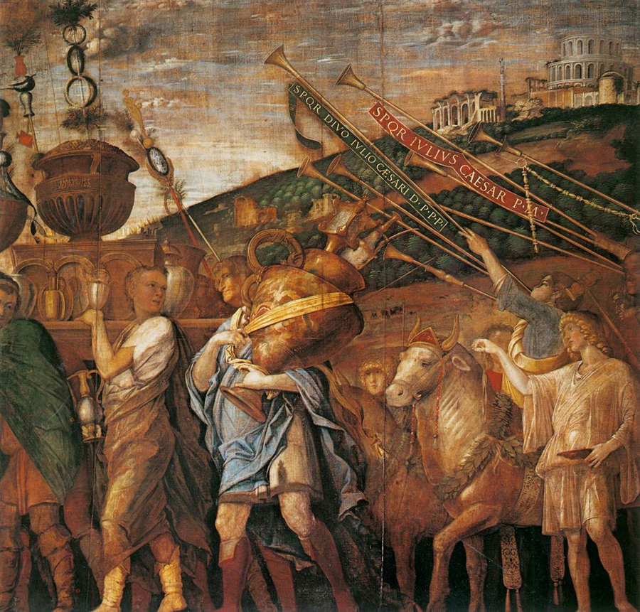 «Триумфы Цезаря» Андреа Мантеньи — цикл монументальных полотен, признанных одним из высочайших достижений искусства Ренессанса. На девяти полотнах изображен Юлий Цезарь (сцена 9), стоящий на триумфальной колеснице по возвращении из успешных военных кампаний. Он возглавляет процессию, состоящую из римских солдат, знаменосцев, музыкантов и военных трофеев.