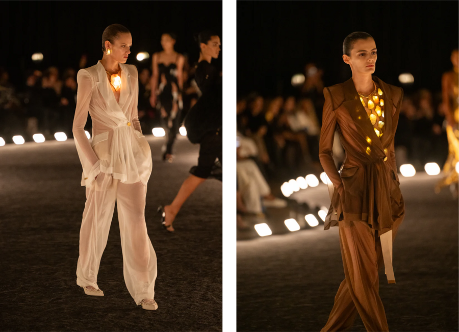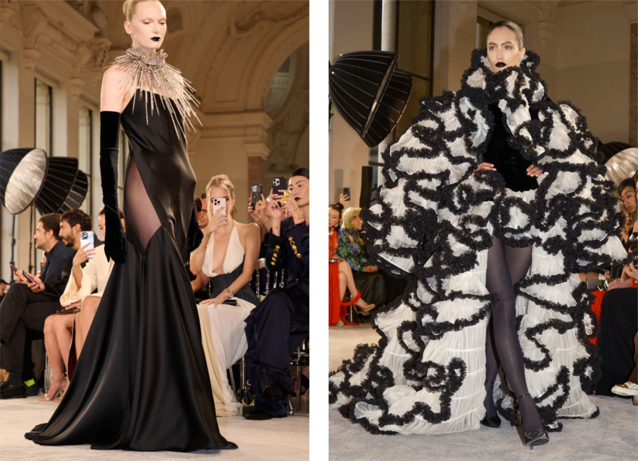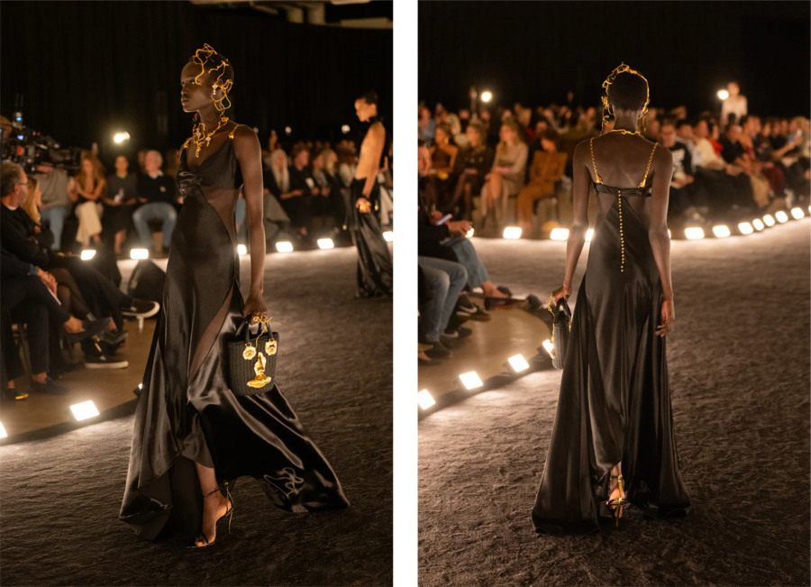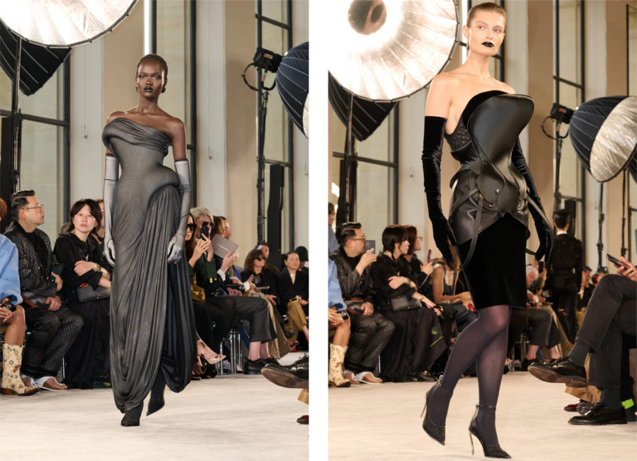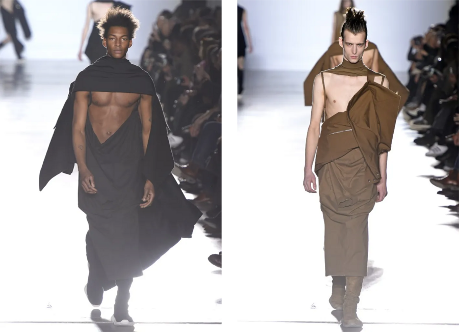 Античная тога, формировала характерную диагональную драпировку через левое плечо, создавая складки sinus и umbo. Эти элементы стали одними из наиболее заметных визуальных цитат в современной высокой моде: Rick Owens, Valentino и Dior используют их для придания фигуре монументального силуэта, который восходит к символическому наследию Цезаря. Не менее важным является эффект скульптурных складок. Тога конструировала тело как архитектурный объект, и именно это качество стало одним из ключевых элементов в работах Schiaparelli, Galliano и Versace, где жесткие ткани, широкие складки и намеренная застывшая пластичность воспроизводят античную идею монументализации личности как знака власти.