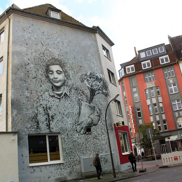 На минарете Jara Mosque он написал стих из Корана: «О люди, Мы создали вас из мужчины и женщины…» Проект вызвал споры: критики считали, что «уличное» нанесение поверх священной архитектуры — неуважение. Но имам мечети поддержал его, и проект воспринимается как акт примирения и диалога.