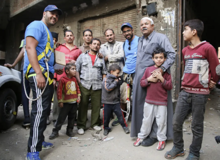 Художник eL Seed, в очках и синей рубашке, стоит с членами своей команды и местной общиной Каира. eL Seed
