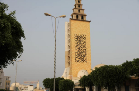 eL Seed / МинаретJara Mosque, мурал со стихом из Корана: «О люди, Мы создали вас из мужчины и женщины…»