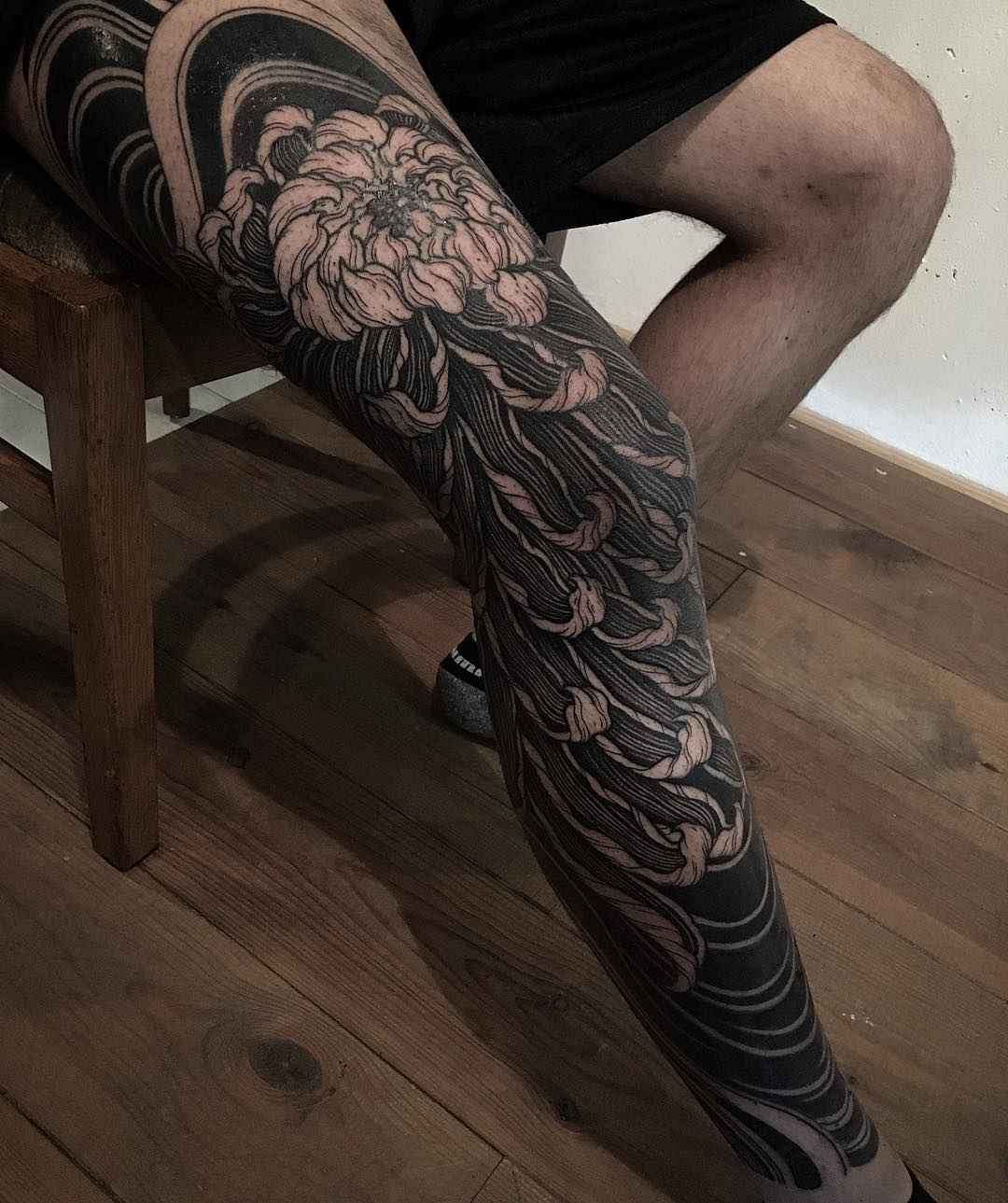 Тату-мастер @gakkinx. Татуировка японских природных мотивов в стиле блэкворк.