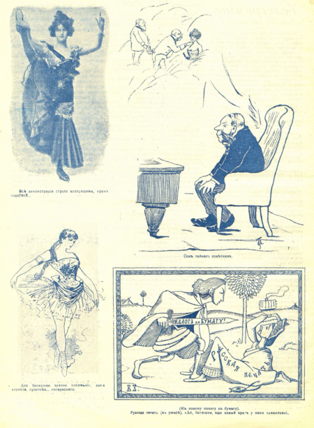В дореволюционных сатирических журналах Российской империи доминировали в основном традиционные шрифты с засечками — антиква, что соответствовало общему стилю печатных изданий того времени. Для заголовков и привлечения внимания применялись более крупные, выразительные и иногда декоративные варианты шрифтов, которые могли иметь контрастные линии и энергичную форму, чтобы усилить сатирический и эмоциональный эффект. В основном, номера журналов не имели четкой структуры.