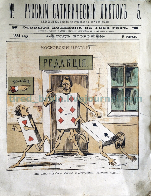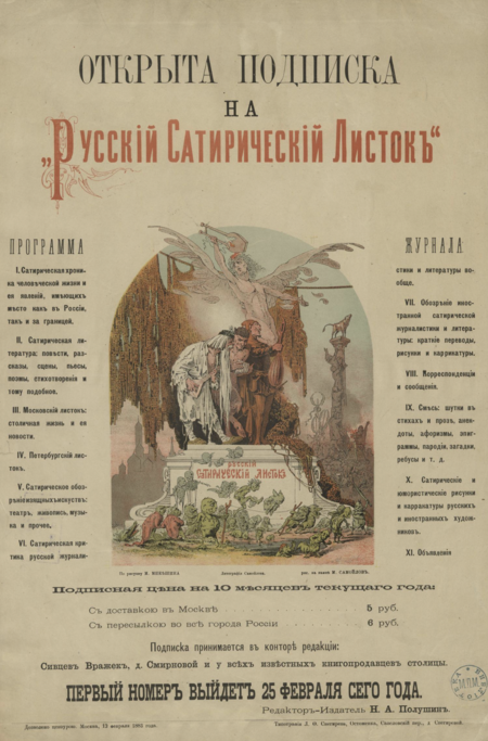 Плакат к № 1 «Русского сатирического листка», издательство Н. А. Полушина, 1883; «Русский сатирический листок», № 5, 1884, издательство Н. А. Полушина