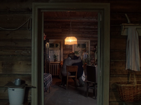 Визуально сцена немного более правильная по композиции, чем сцены в купе, но атмосфера ощущается тяжелой и формальной. Сцена показывает то, как Вера должна жить по нормам, по правилам. Но там нет места свободе, есть только бессмысленное соответствие. А Любовь к Платону — нарушение этого соответствия.