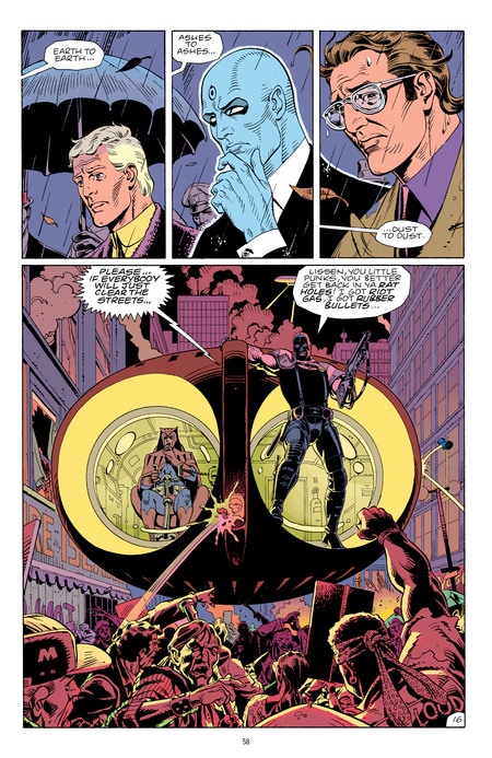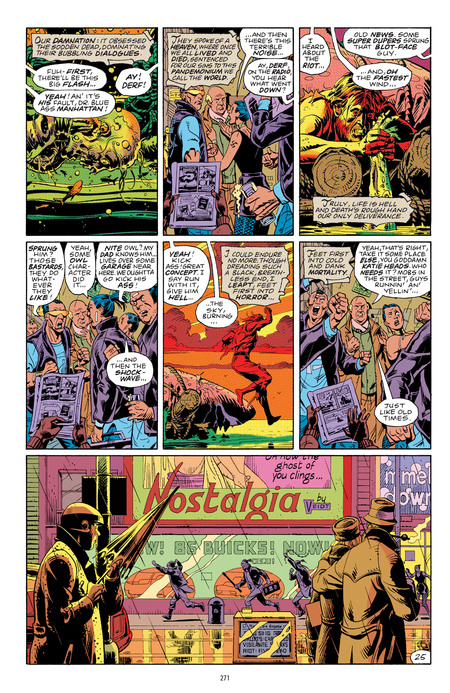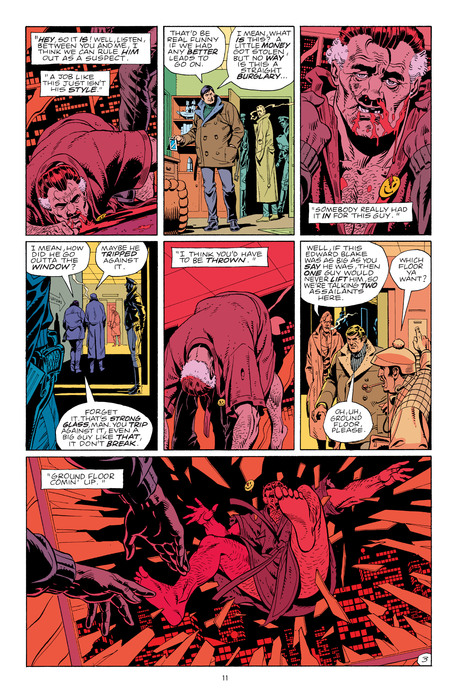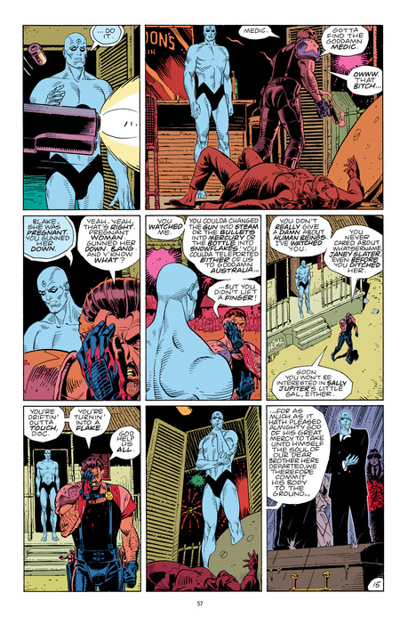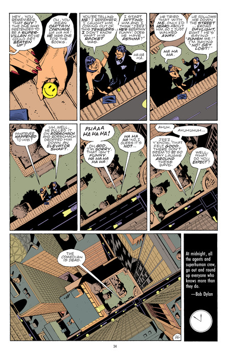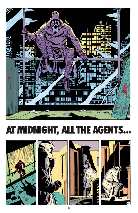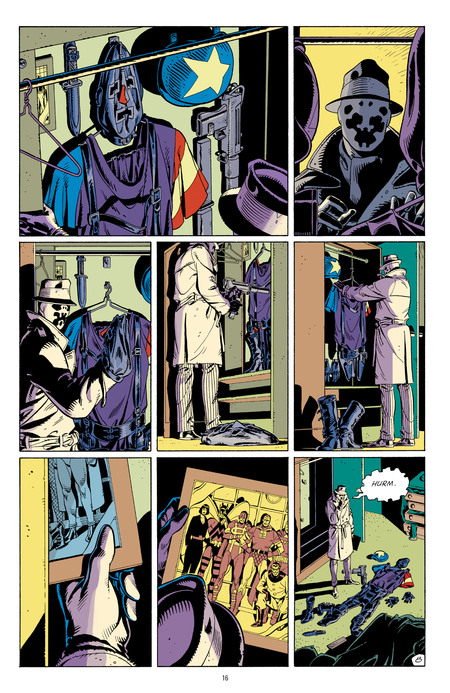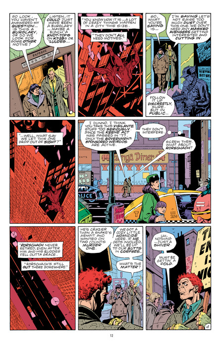 Rorschach and Nite Owl (Dan Dreiberg) examine the crime scene and make assumptions about the type of crime and possible attackers. This is a moral statement rather than a child’s fantasy.