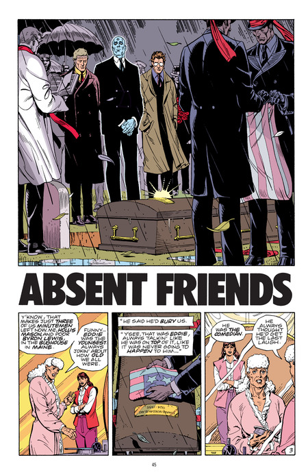 The book employs strict composition, mirrored layouts, and recurring images (clocks, blood, reflections, advertisements, the pirate comic) to transform the superhero story into a complex system almost a mechanical «watch» that the reader must mentally put together. This is evident from chapter 1's opening fall of the smiley badge to later issues like «Watchmaker» and «Fearful Symmetry.»