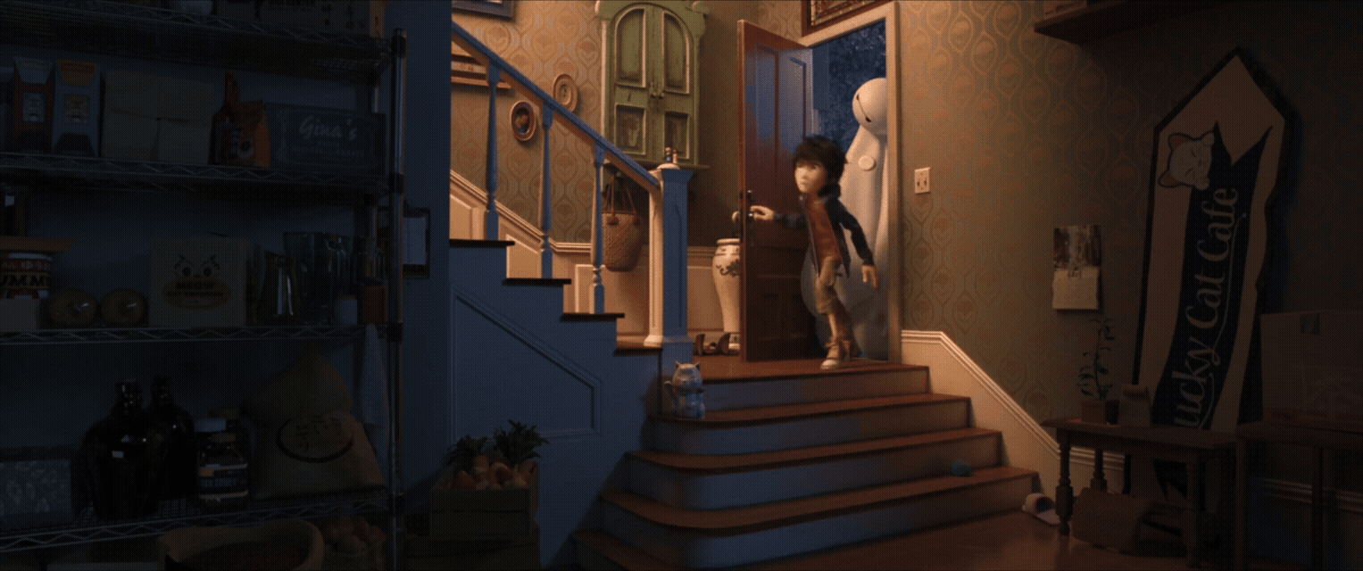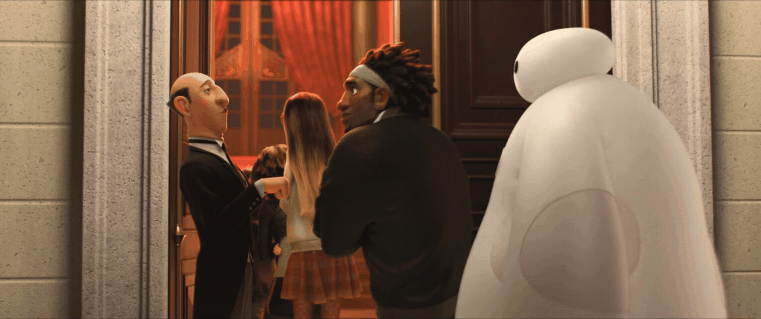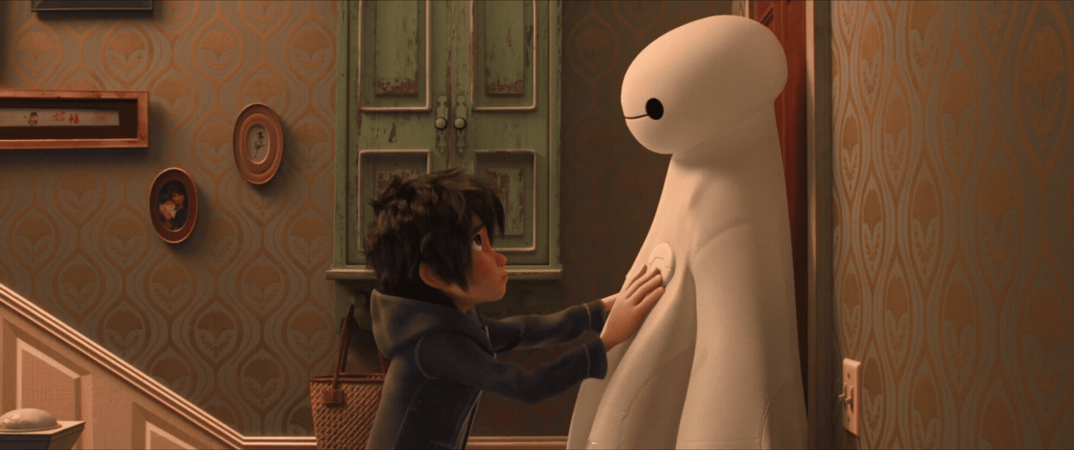 Бэймакс подмечает действия Хиро и повторяет их. Подстраивается под окружением.