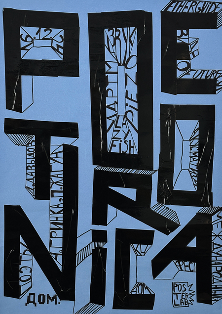 Информация о фестивале встраивается в случайные объёмные детали названия мероприятия, усиливая глубину плаката. Надпись из скотча обозначает электро музыку, тогда как тонкие линии маркера проводят параллель с поэзией. Таким образом соединяются две сущности фестиваля Поэтроники.