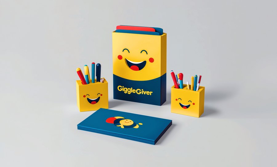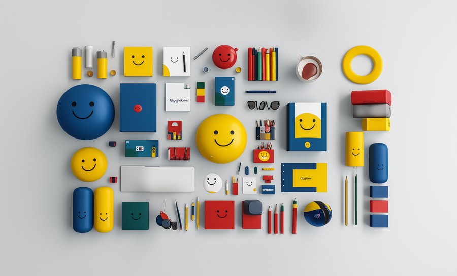 Visual identity for laughter donation service brand «GiggleGiver». Illustrations of smile people, happy prints. Many 3d objects of Package, Notepads, pen, postcards, stickers, business cards. Colours: yellow, dark blue, red, green, white. Photo of all printing and advertising products. Minimalistic 3d style. Light grey background. --v 6.0
