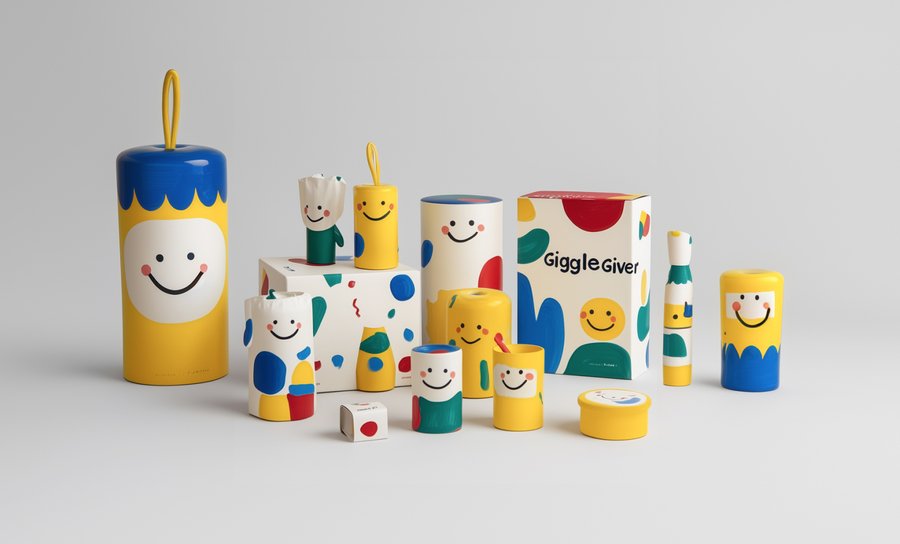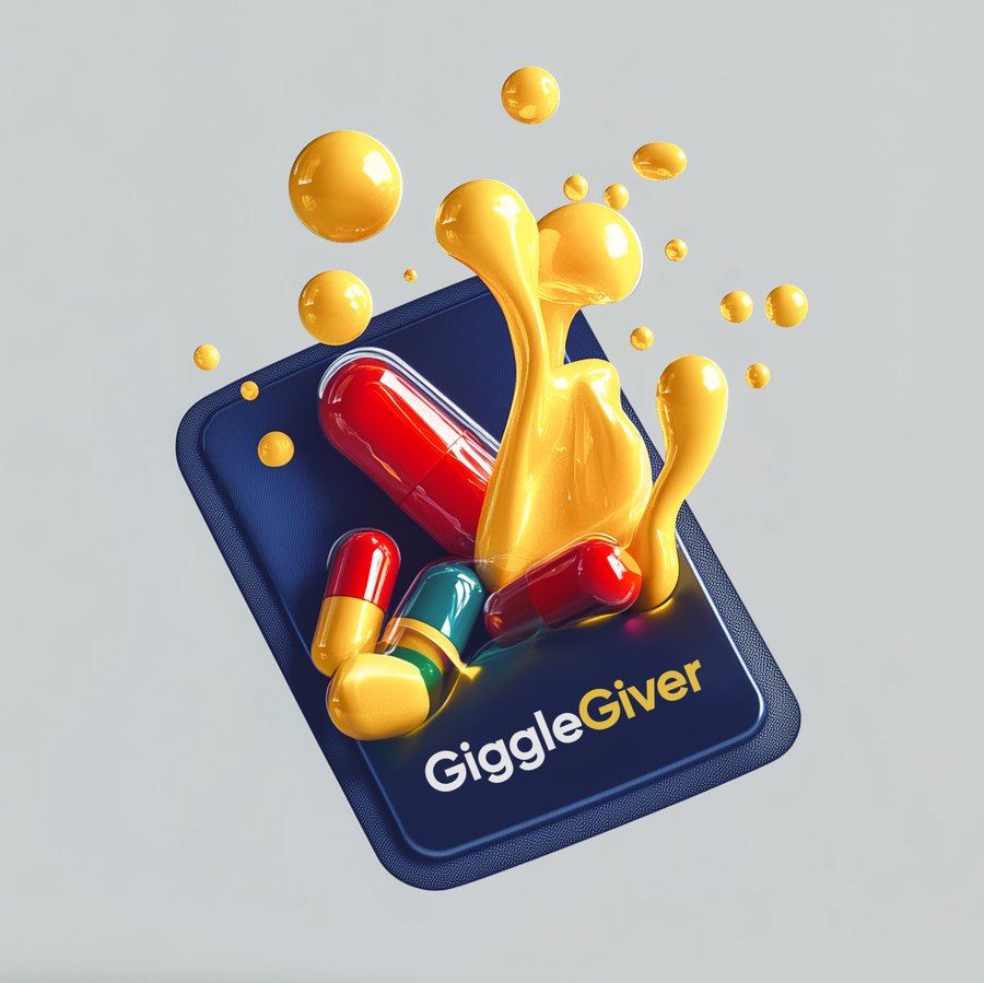 https://s.mj.run/2PYCOpL9hro Medicine packaging for laughter donation service brand «GiggleGiver». Medicine from which yellow liquid and bubbles are pouring. Colours: yellow, dark blue, red, green, white. Minimalistic 3d style. Photo of packaging. Light gray background. --v 6.1