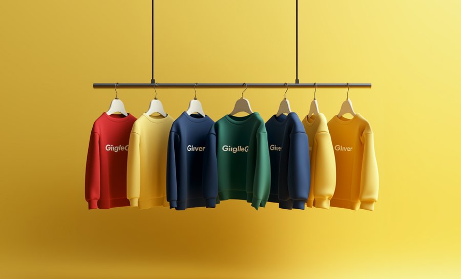 3d clothes mockup for laughter donation service brand «GiggleGiver». Colours: yellow, dark blue, red, green, white. Minimalistic 3d style. Photo of clothes. Light yellow background. --v 6.1
