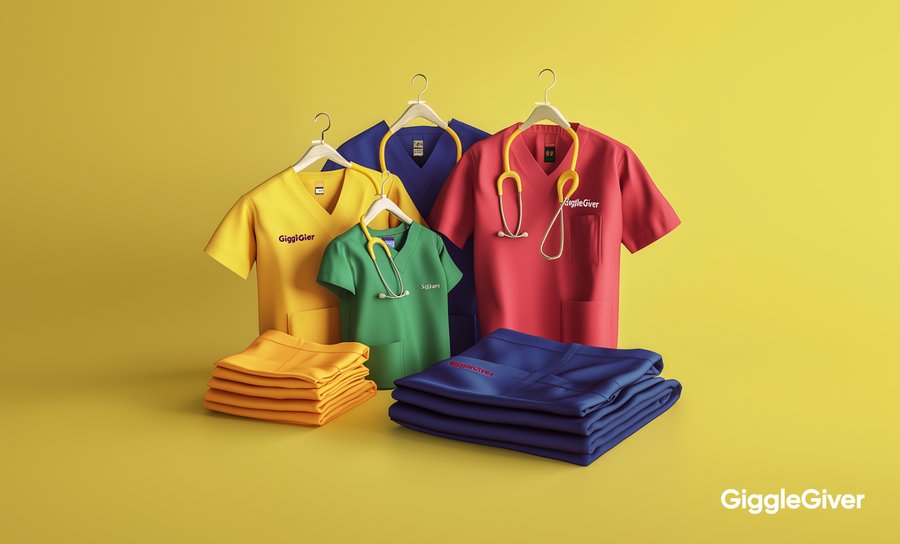 medical stuff colthes mockup for laughter donation service brand «GiggleGiver». Colours: yellow, dark blue, red, green, white. Minimalistic 3d style. Photo of clothes. Light yellow background. --v 6.1