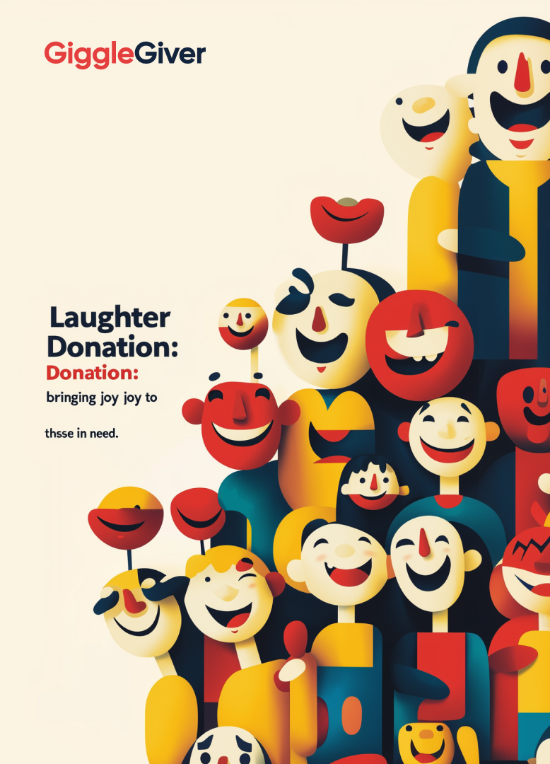 A poster for the GiggleGiver Medical Center for laughter Donation. Text on poster «GiggleGiver». Illustrations of smile people, happy prints. Colours: yellow, dark blue, red, green, white. Minimalistic 3d style. Photo of the poster. --v 6.1
