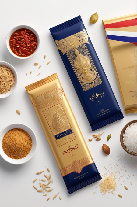 Промпт для Leonardo Ai: generate one bar for thai brand with the label «KHWATHAI». All the materials have a minimal style, inspired by Thailand aesthetic, using gold, thai national pattern, traditional fonts, navy blue and dark red colors. The background is white. Include rice elements.