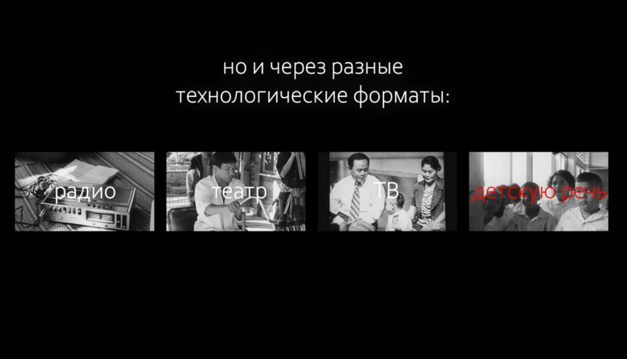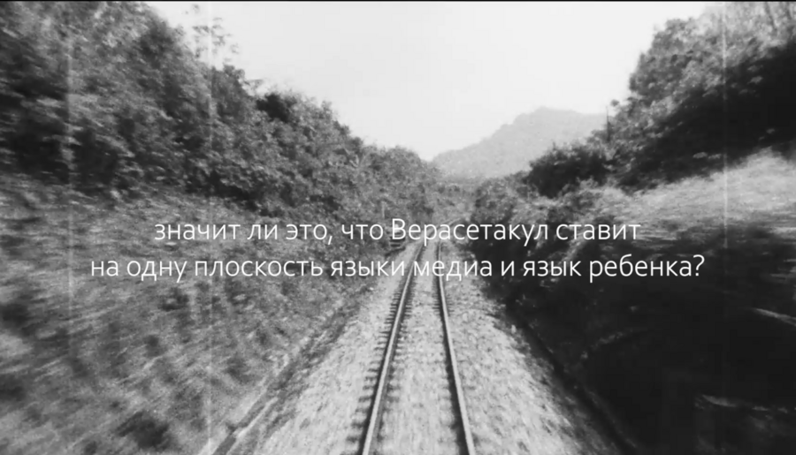 Значит ли это, что Верасетакул ставит на одну плоскость языки медиа и язык ребенка? Как бы говорит нам: одну и ту же историю можно рассказать множеством способов, кинематографически, театрально, литературно или… по-детски. А если детство или ребенок в фильме Верасетакула действительно становится особым видом медиа, то какие особенности, приемы и свойства отличают эту отдельную технологию рассказывания историй?