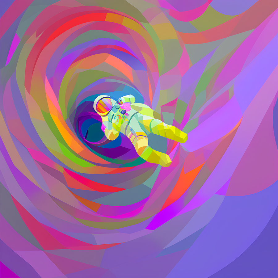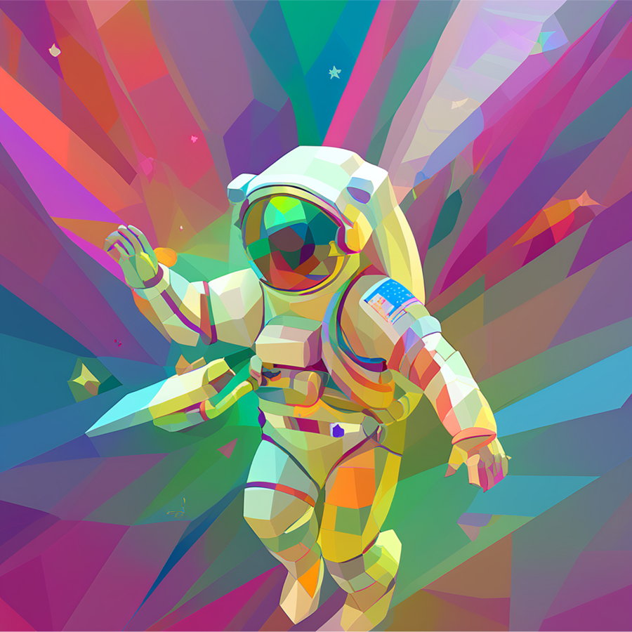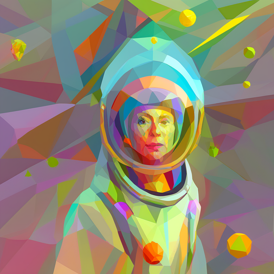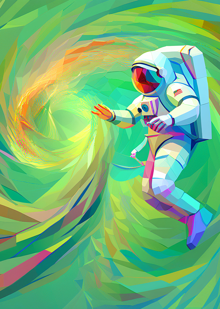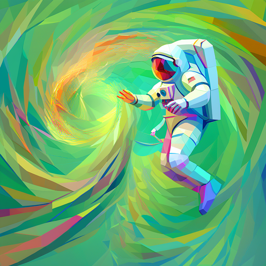 Основной промпт: «art collage in TSEVIS style, astronaut floating in space tethered to spaceship, suit made from glowing geometric patches, stars and planets as layered radial shapes in the background» * Дополнительный промпт: «art collage in TSEVIS style, astronaut floating through a wormhole made of twisting geometric spirals»