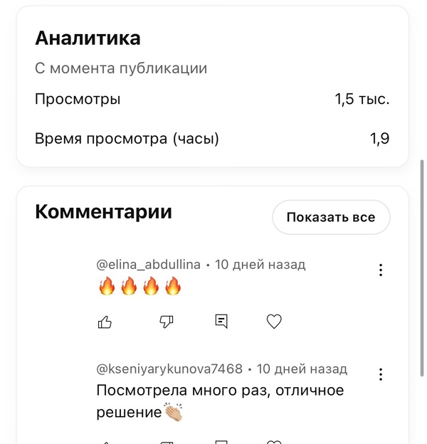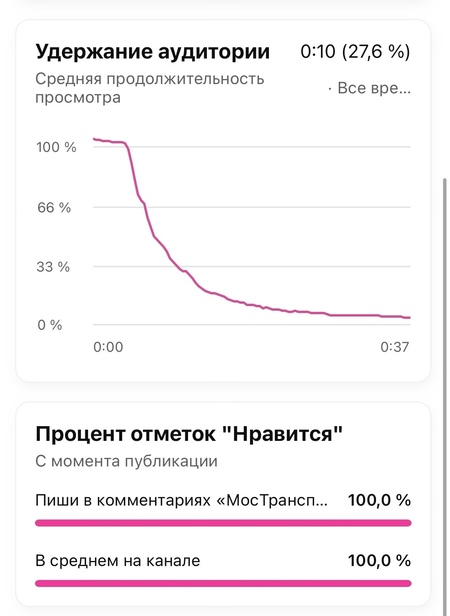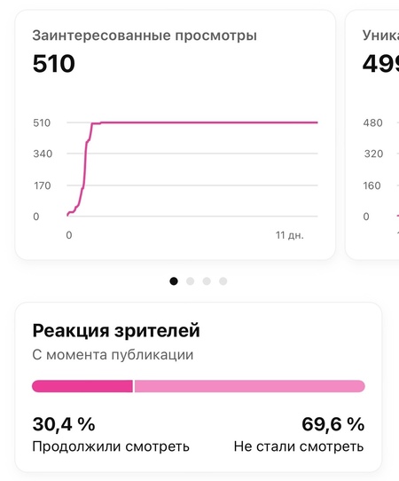 За несколько дней видео набрало 1506 просмотров, 10 лайков и 5 положительных комментариев. RR составил 30,4 процента, что неплохо, но можно ещё улучшить. На графике видно, что зрители резко перелистывали видео спустя 2-3 секунды. Я думаю, первый кадр нужно делать более цепляющим, чтобы люди продолжали просмотр. Например, сделать вводный кадр длительностью не больше 2.5 секунд, или поменять его местами с кадром людей.