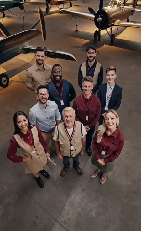 A young woman and man stand side by side in a metro uniform with staff badges, red metro wagon in the background, day studio light