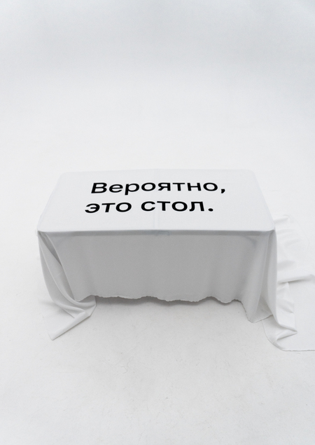 Концепт в философии Ж. Делёза понимается как инструмент для создания новых смыслов, а не просто определения вещей. Стол становится полем для переосмысления повседневного, где очевидность ставится под сомнение. Надпись на скатерти разрушает уверенность в том, что мы знаем, что такое «стол», провоцируя зрителя к диалогу с реальностью.