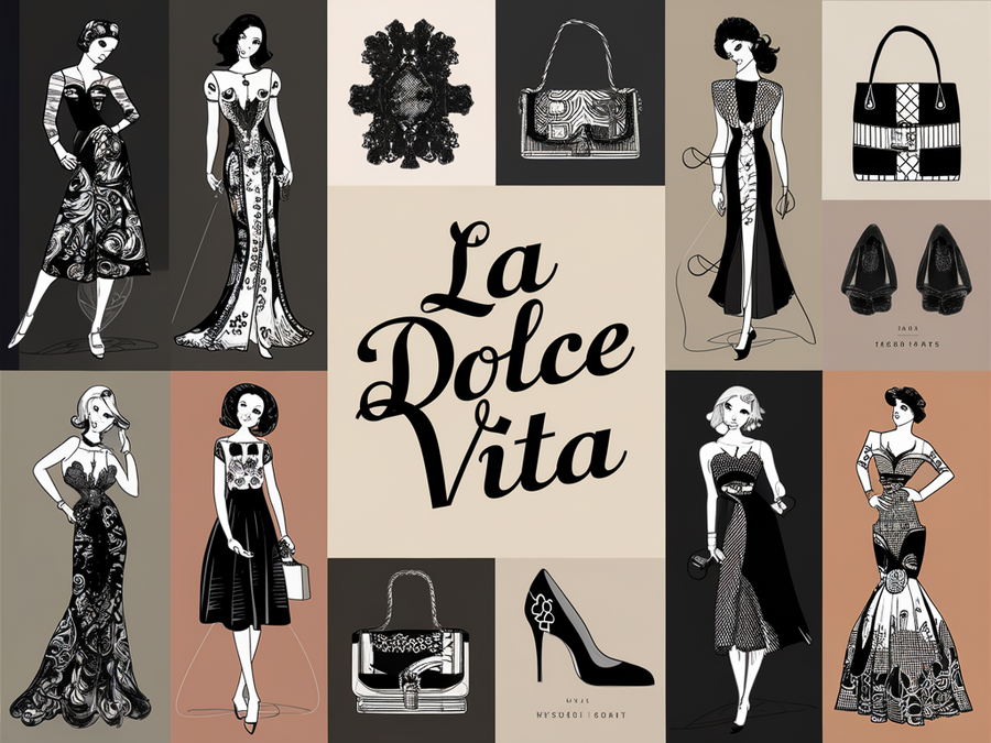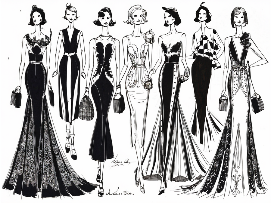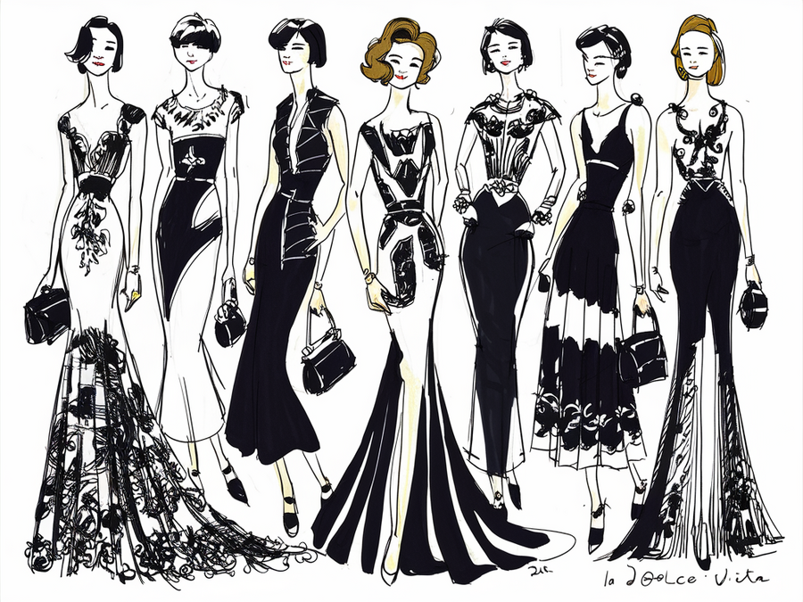 ПРОМПТ: A collection of exquisite sketches for the luxury womenswear brand «La Dolce Vita,» drawing inspiration from the 1960s bourgeoisie fashion in Federico Fellini’s cult film. The sketches showcase elegant black and white evening gowns, each with its own unique design element, from intricate lace patterns to bold, geometric shapes. The drawings capture the essence of the timeless glamour and sophistication of the era, with a modern twist. The overall mood of the sketches is elegant, nostalgic, and timeless.