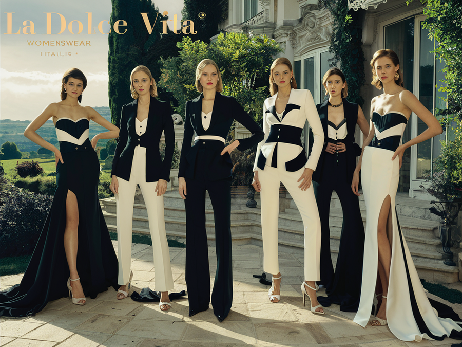 ПРОМПТ: A glamorous fashion campaign for the «La Dolce Vita» womenswear brand in Italy. Models are donning elegant and bold black and white floor-length dresses, three-piece suits, and light-reflecting corsets with high heels. The setting is a luxurious, vintage-style Italian mansion, with ornate architecture, lush greenery, and a stunning view of the countryside. The overall ambiance is sophisticated and timeless, reminiscent of the 1960s bourgeoisie fashion era.