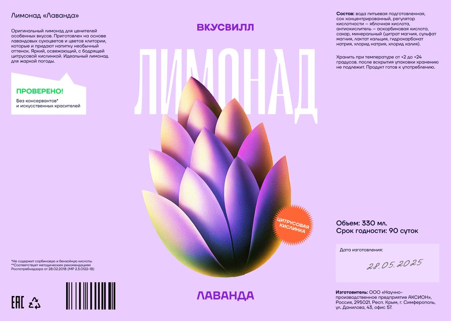 Графика вкуса выполнена в единой стилистике, крупном размере, в виде кругообразного центрального объекта, без дополнительных деталей. Заголовок размещен на заднем плане, графика поверх создает объем.