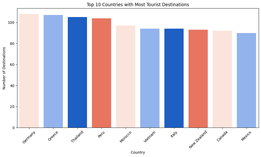 Этот график показывает, какие страны имеют наибольшее количество популярных туристических мест. Каждый столбец соответствует стране, высота отражает число достопримечательностей. Можно быстро увидеть лидеров по туризму и страны с разнообразными направлениями, например, Германия, Греция и Тайланд. График помогает сравнивать страны между собой и выявлять основные точки притяжения туристов.