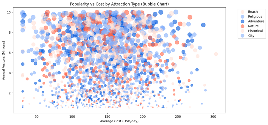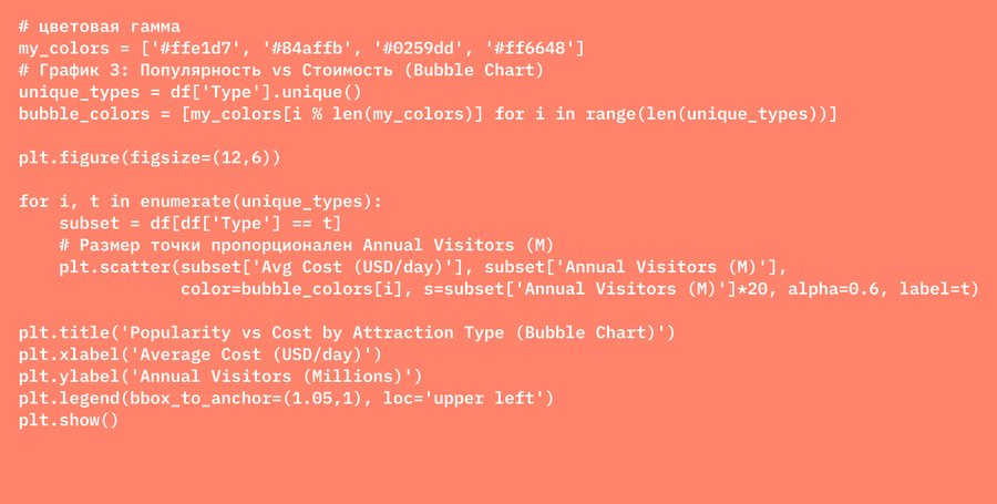 Показывает связь между средней стоимостью и посещаемостью. По оси X — стоимость, по оси Y — количество туристов, а размер точек обозначает популярность. Цвета отражают тип достопримечательности. График помогает выявить тренды: дорогие направления с высокой посещаемостью или бюджетные объекты с низкой популярностью. Bubble chart визуально сравнивает числовые переменные и показывает зависимость между ними.