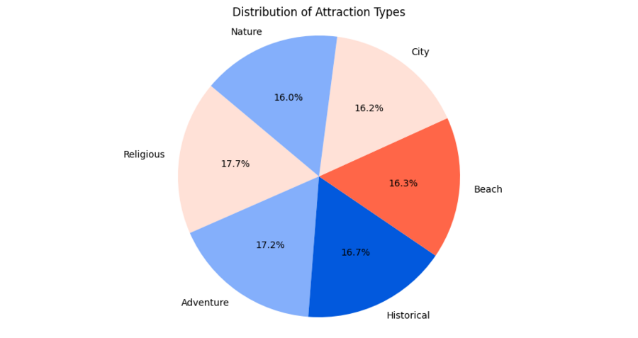 Диаграмма распределяет туристические направления по типам: исторические объекты, музеи, природные достопримечательности, религиозные локации, необычные достопримечательности, пляжный отдых. Размер сектора показывает долю категории, несколько оттенков выбранной палитры различают типы. График помогает формировать выводы о предпочтениях туристов.