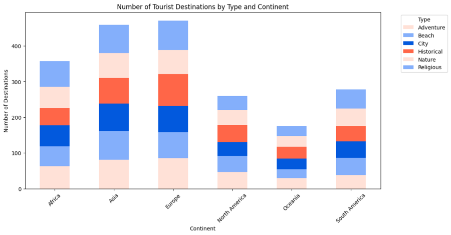 Stacked bar — отображает количество достопримечательностей по типам для каждого континента, чтобы сравнить регионы.