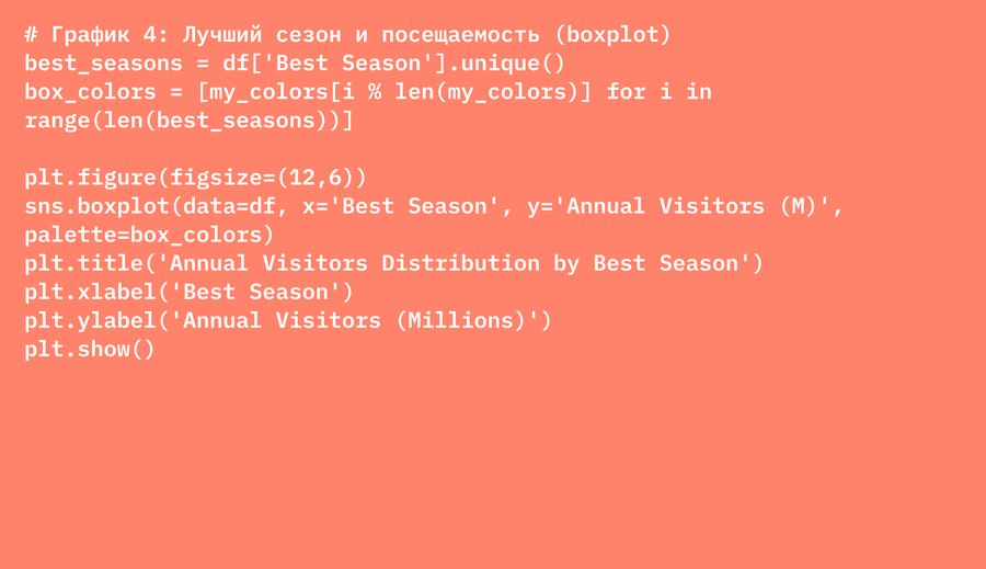 Boxplot — показывает распределение посещаемости по сезонам, выявляет средние значения и выбросы.