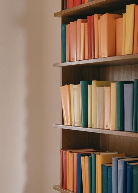 Обложка проекта сгенерирована с помощью нейросети Ideogram. Промт: Minimalist photograph of a wooden bookshelf on which a collection of bright, colorful books are neatly arranged. The background is simple and clean.