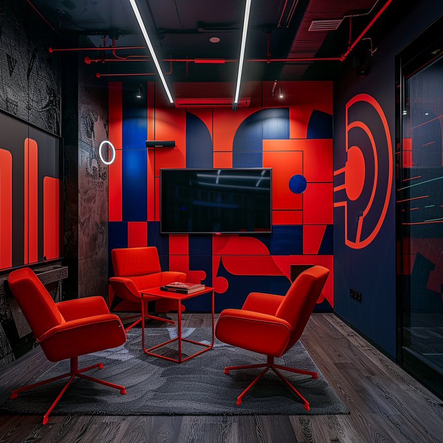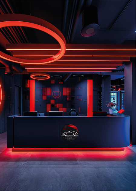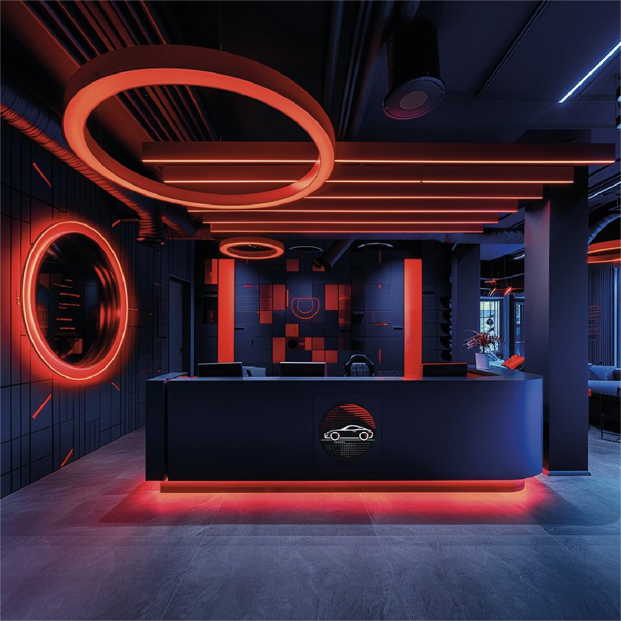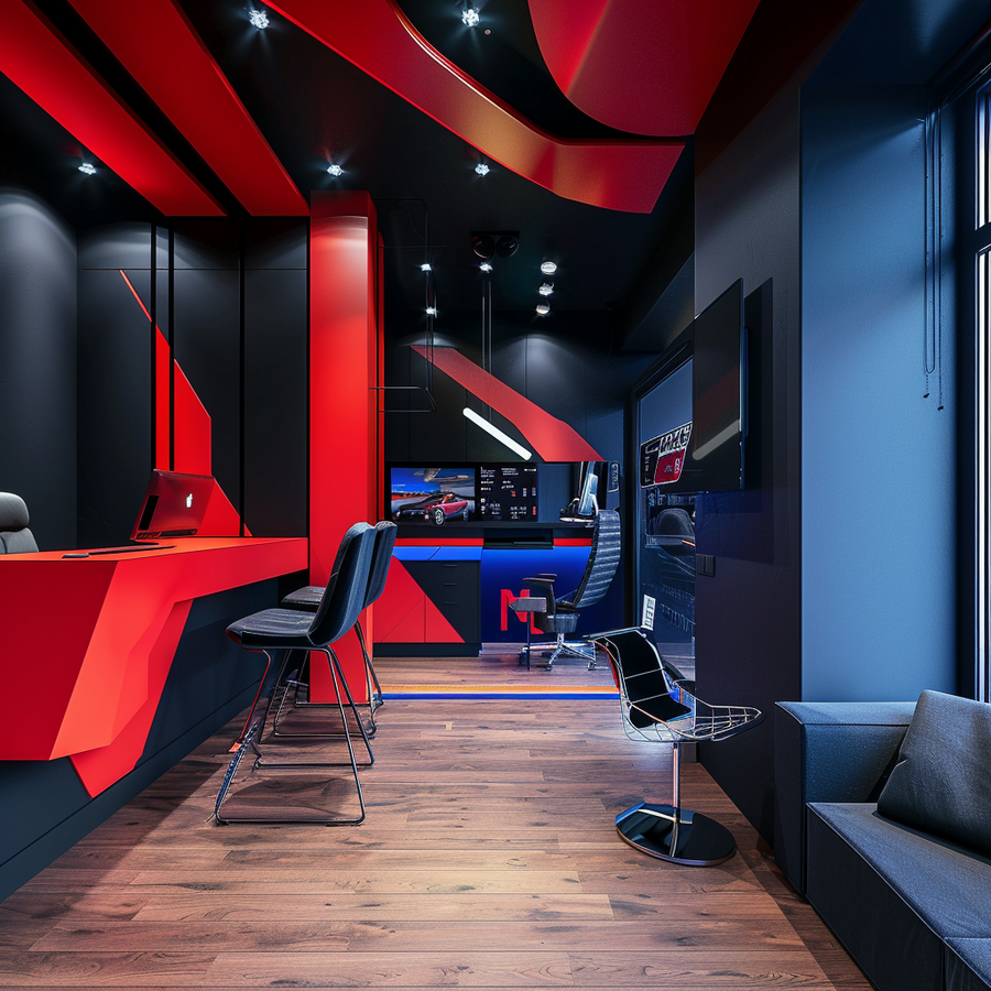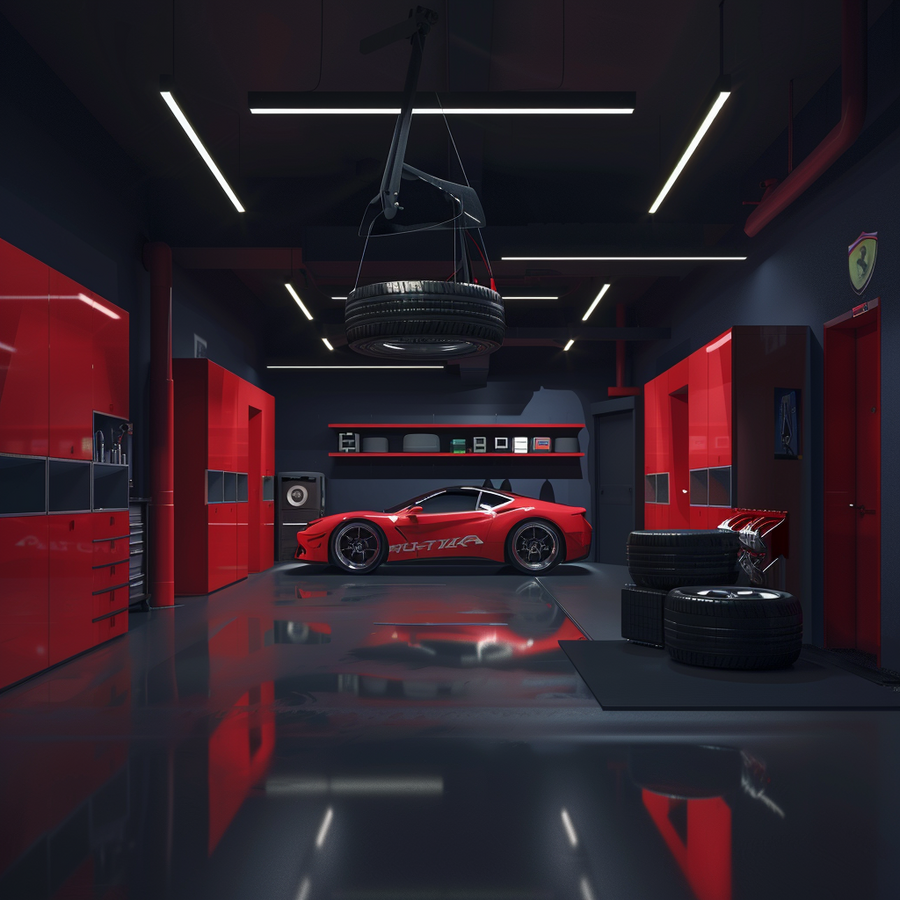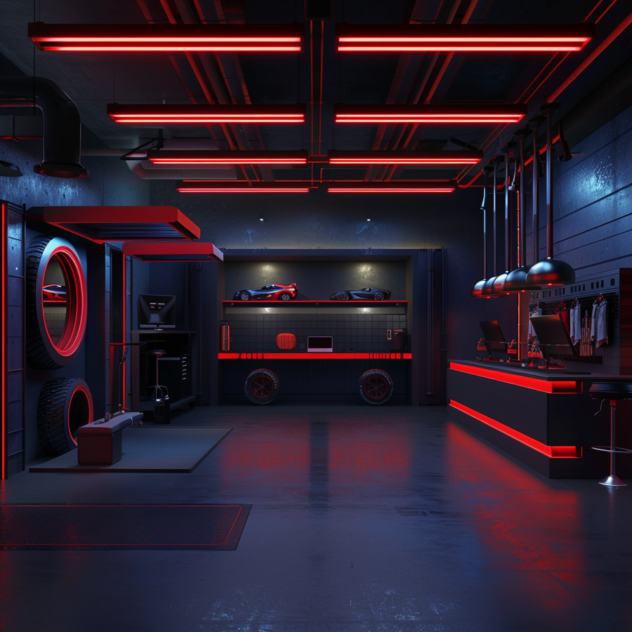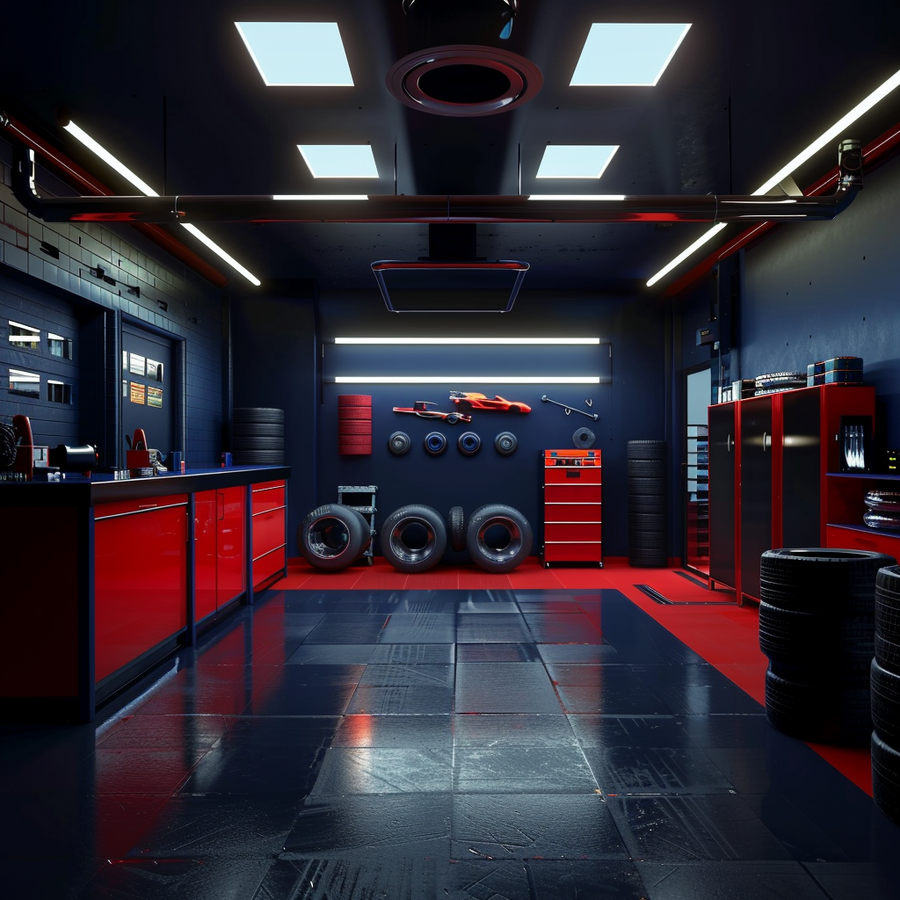 image of a minimalistic modern tuning studio in red and dark blue tones, inside of which there is a workshop for selecting tires, car painting and a car maintenance service, realism style ar 3:2 chaos 15 --v 6.0 --style raw