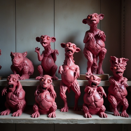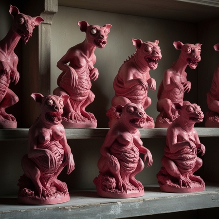 «Figurines of altered, distorted beyond recognition, hypertrophied images of animals made of pink plaster»