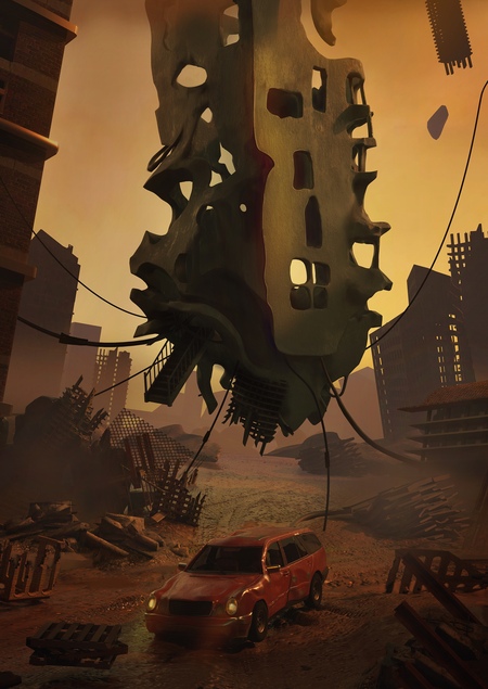 Бывший квартал превратился в пустой и деформированный район, в центре которого возвышается гигантский оплавленный небоскрёб, словно стекающий на землю под воздействием палящего солнца.