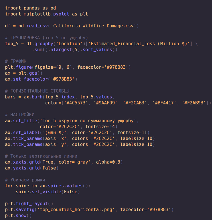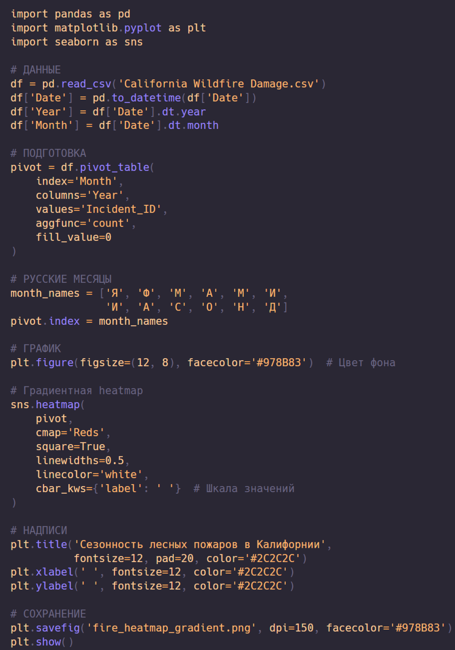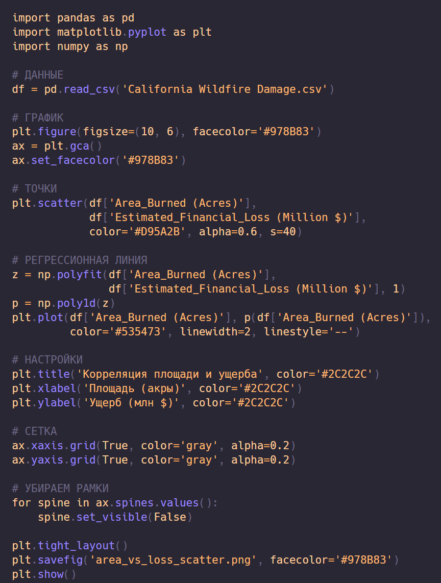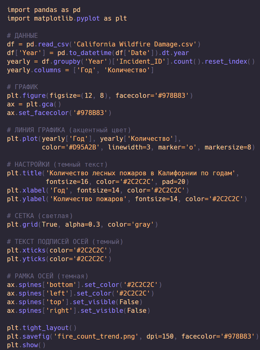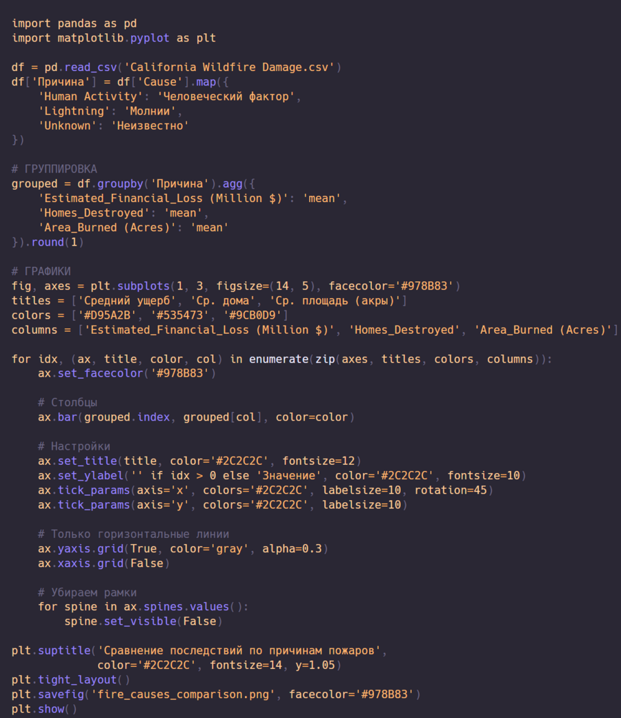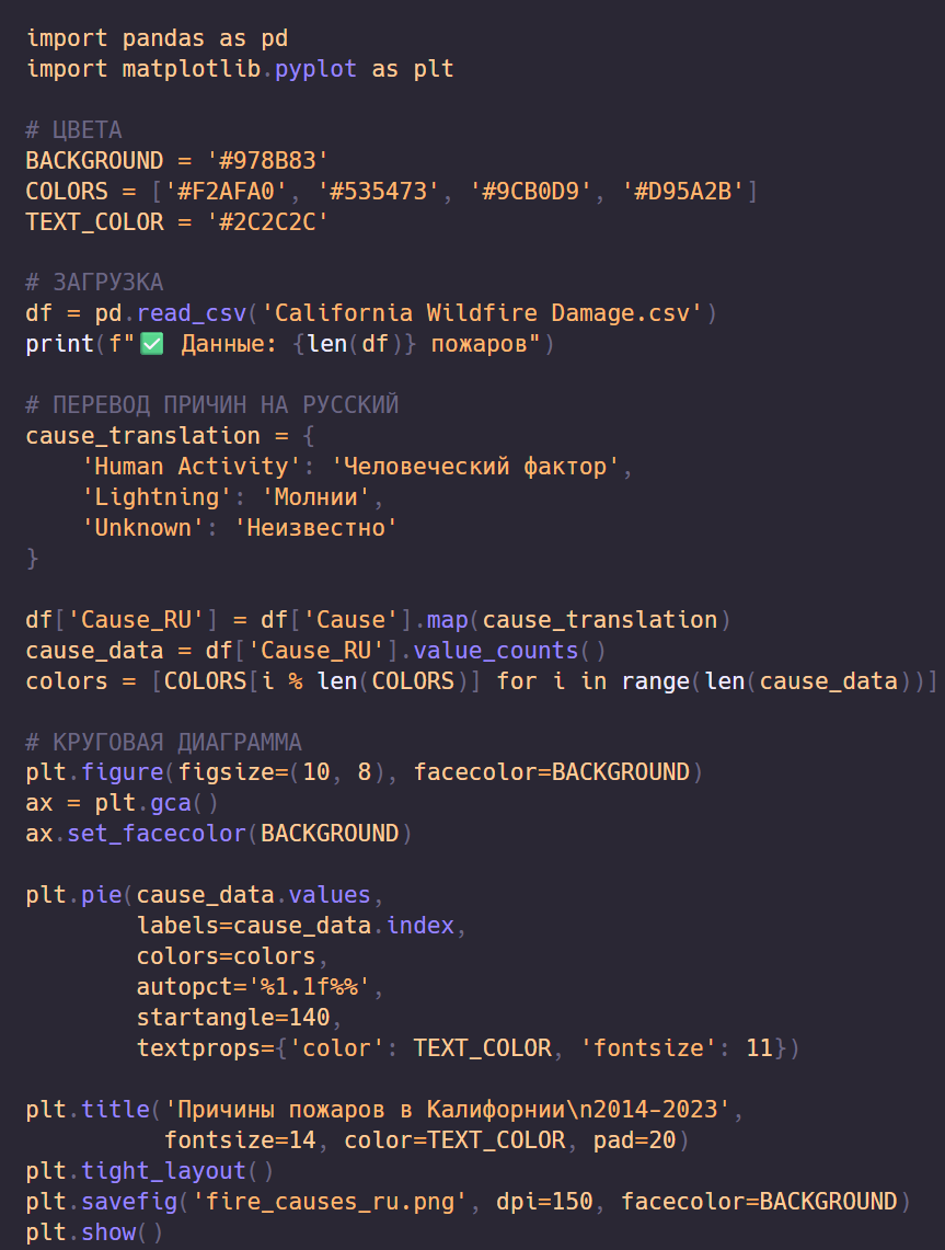 В ходе работы были сделаны: круговая диаграмма с причинами пожаров, столбчатые диаграммы последствий в зависимости от причины пожара, тепловая карта с сезонностью пожаров, график с количеством пожаров по годам, горизонтальная столбчатая диаграмму с топ-5 округов по суммарному ущербу и точечная схему корреляции ущерба и площади пожаров. Были выбраны именно эти типы визуализации, так как они лучше всего демонстрируют соответствующие им данные.