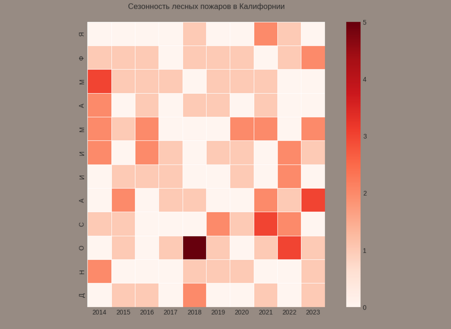 Рассматривая получившуюся температурную карту, можно решительно заявить, что наибольшее количество лесных пожаров в Калифорнии возникает в период с августа по октябрь, более того самое большое указанное значение относится к октябрю 2018 года.