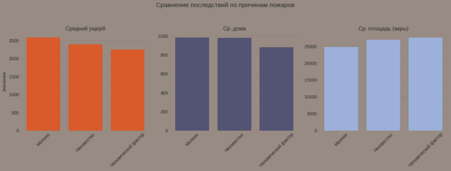 Анализируя взаимосвязь причин возникновения пожара и масштабность его разрушений по столбчатым диаграммам, можно заметить, что в нанесенном ущербе и количестве разрушенных домов молнии лидируют, за ними следует категория с неизвестной причиной, а завершающим становится человеческий фактор.