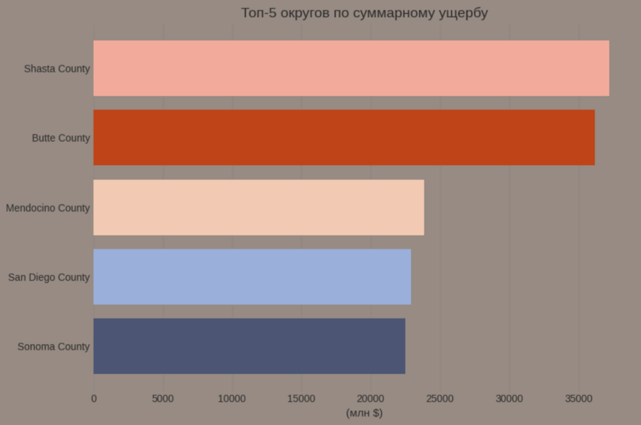 Больше всего не повезло округу Shasta County и Butte County, там убытки составляют более 3500 миллионов долларов. Топ закрывает Sonoma County с убытками, превышающими 2000 миллионов долларов.