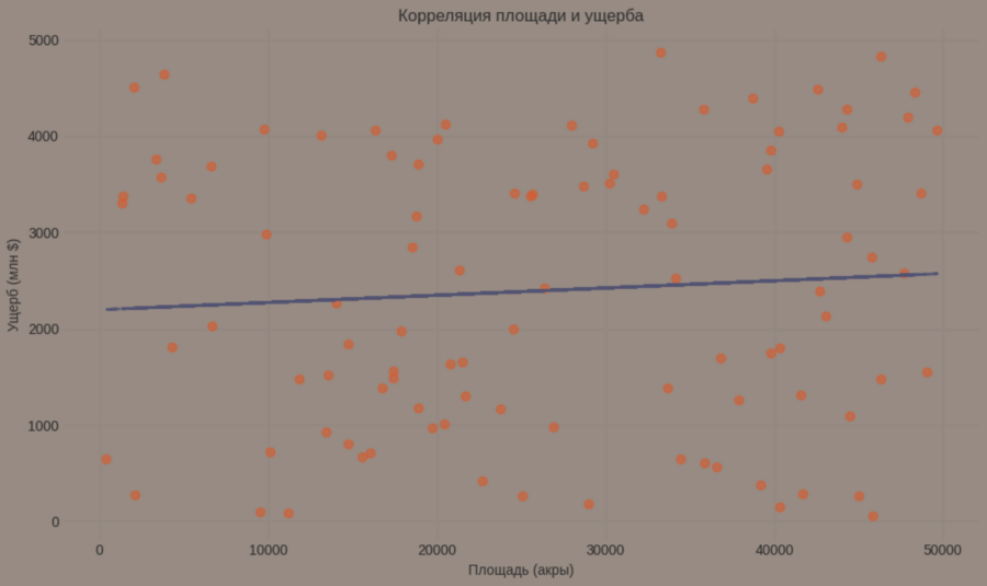 Попытка найти взаимосвязь между площадью пожара и принесенным ущербом, на удивление, в ходе практического анализа не оправдалась. Как можно увидеть на диаграмме корреляция между этими факторами присутствует, но она настолько мала, что ее никак нельзя считать значимой