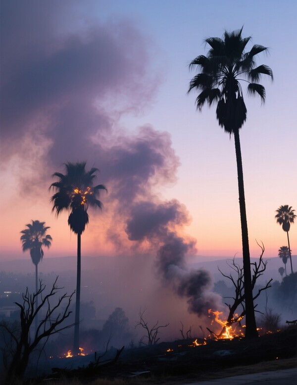 При создании иллюстративного ряда к проекту, была сгенерировано изображение одной из улиц Калифорнии, которая, как мне показалось, идеально передает противоречивые чувства, возникающие при осмыслении катастрофичности подобных событий.