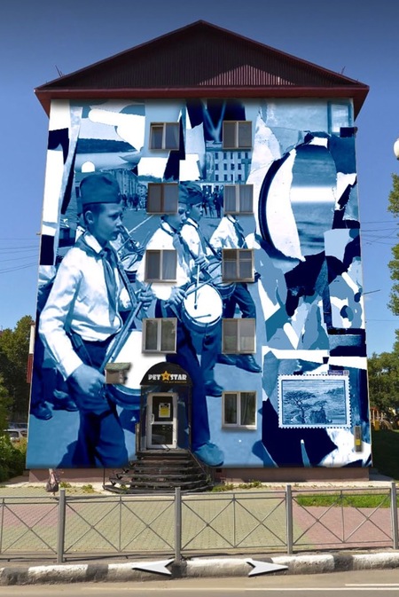 Эскиз для мурала представляет собой цифровой коллаж, включающий в себя старые фо- тографии с Сахалина, графику с почтовой марки, а также элементы моих бумажных колла- жей. Ключевые слова для описания работы: музыка, движение и природа. Главным сюжетом мурала является фотография пионеров, играющих на барабанах во время парадов. На- звание «Гром» описывает всеобъемлющий шум этих инструментов. В советское время по- добные музыкальные шествия проходили на улицах Южно-Сахалинска, не исключено что они звучали и на проспекте Победы. Ребята идут слева-направо, символизируя движение вперёд. Проспект заканчивается видом на гору и старая почтовая марка с изображением моря, скал и деревьев, напоминает людям об уникальной природе острова и путешествиях. При создании композиции для эскиза были учтены внешние элементы здания (окна, ниж- няя дверь и т. д.). Главная фигура барабанщика расположена в левой части здания. Почто- вая марка расположена в правой нижней части, для того чтобы этот элемент лучше считы- вался с пешеходной зоны.