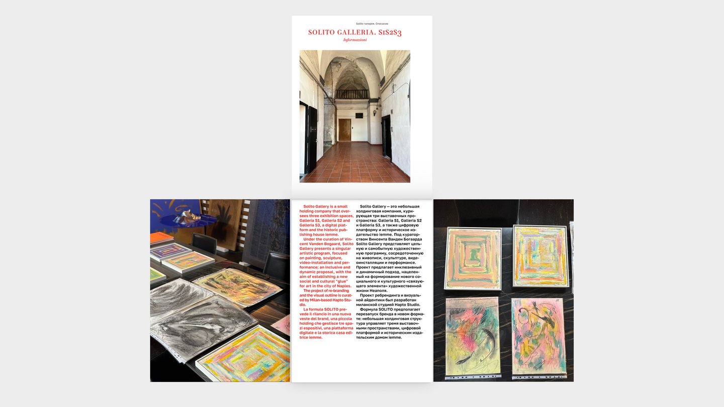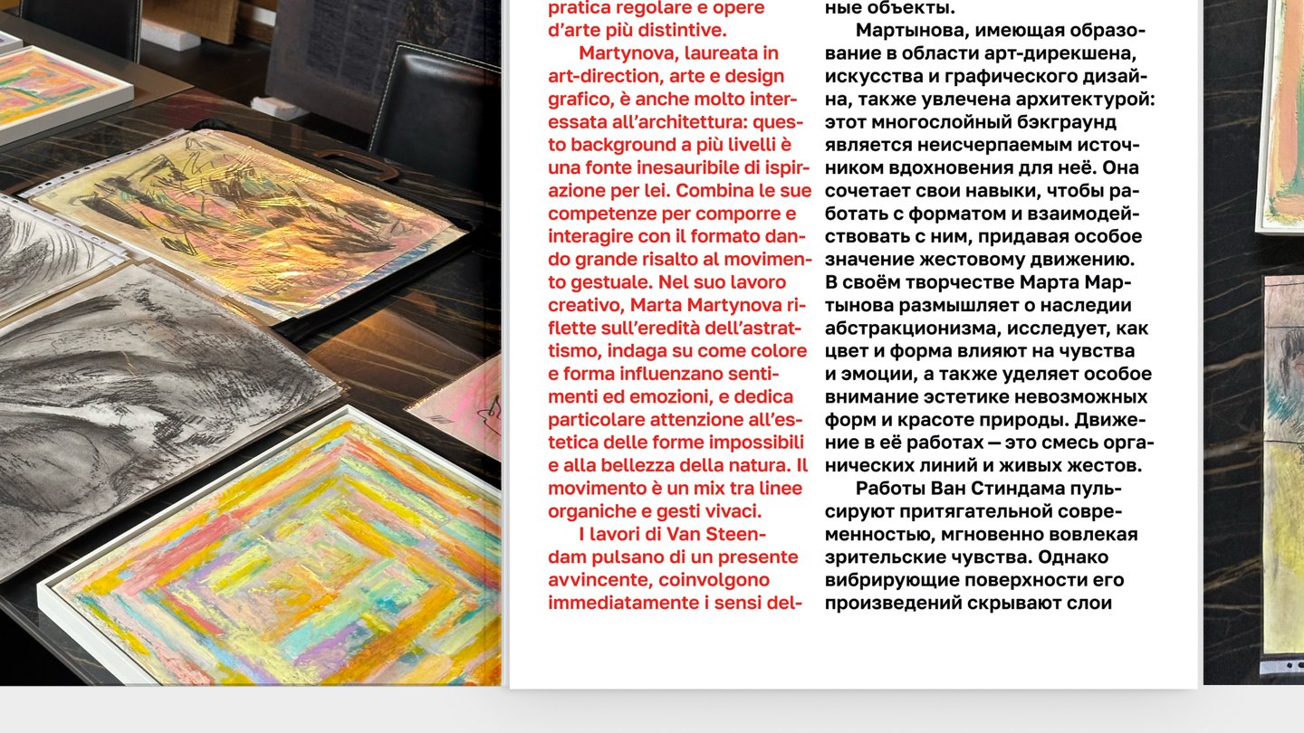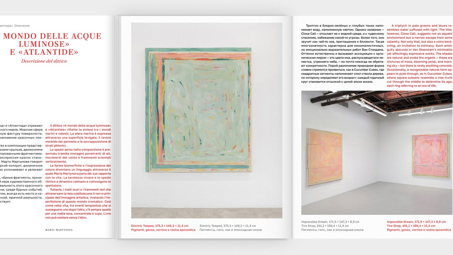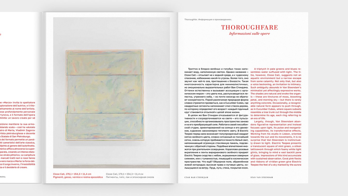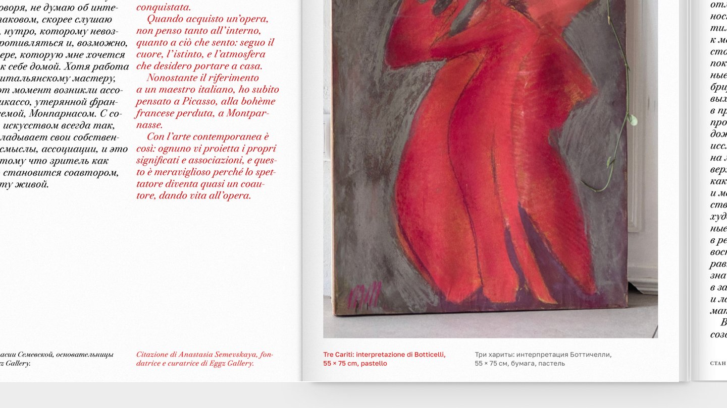 Центральная ось текста смещена так, чтобы русский текст занимал пять колонок, а итальянский — четыре. Это позволяет визуально уравновесить объём двух блоков и добиться того, чтобы они заканчивались примерно на одном уровне, нейтрализуя эффект, что кириллица при наборе занимает больше места, чем латиница. На этом принципе построена вся верстка книги: структура распространяется на подписи к картинам, заголовки и даже колонтитулы. Текст на итальянском выделен красным цветом, который является фирменным цветом галереи Solito.