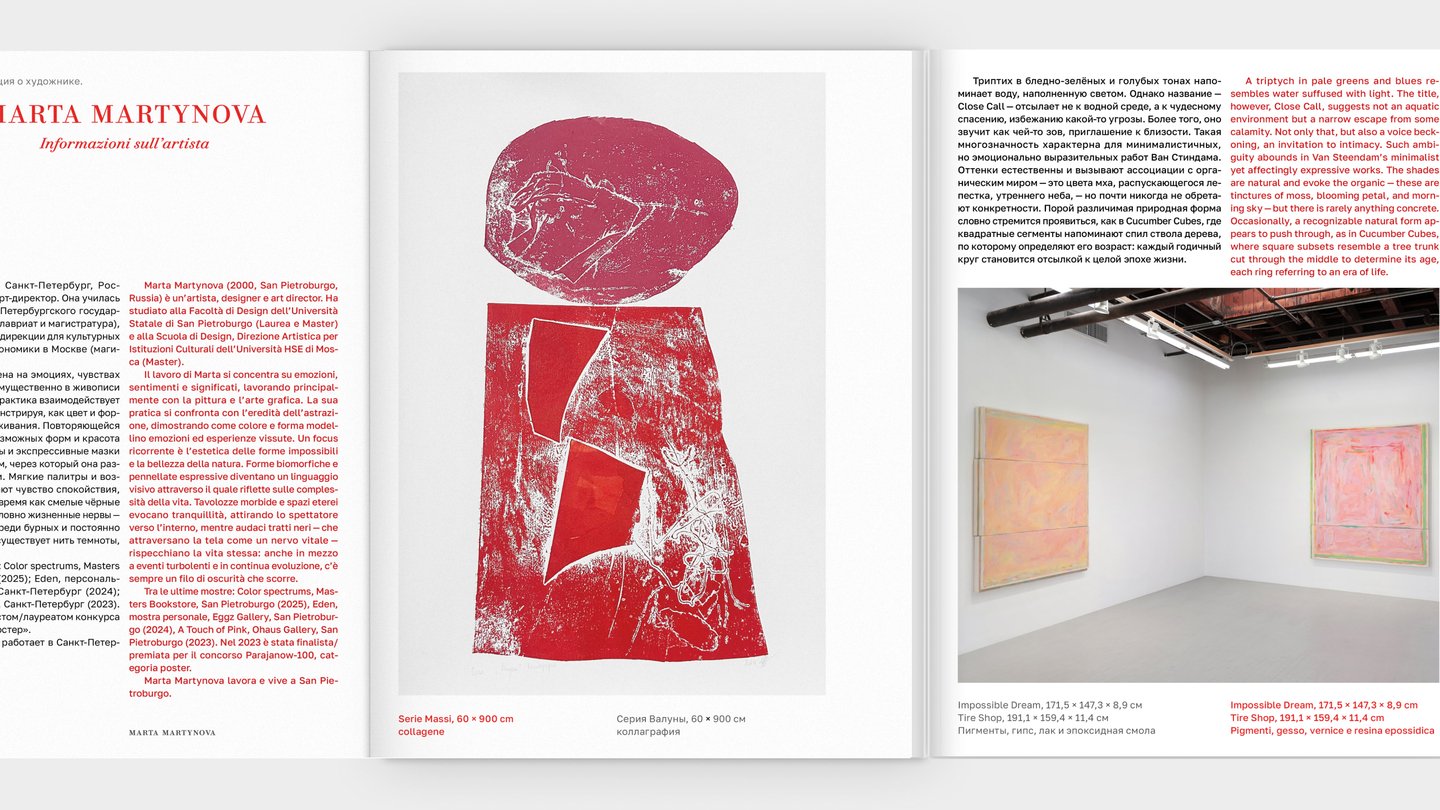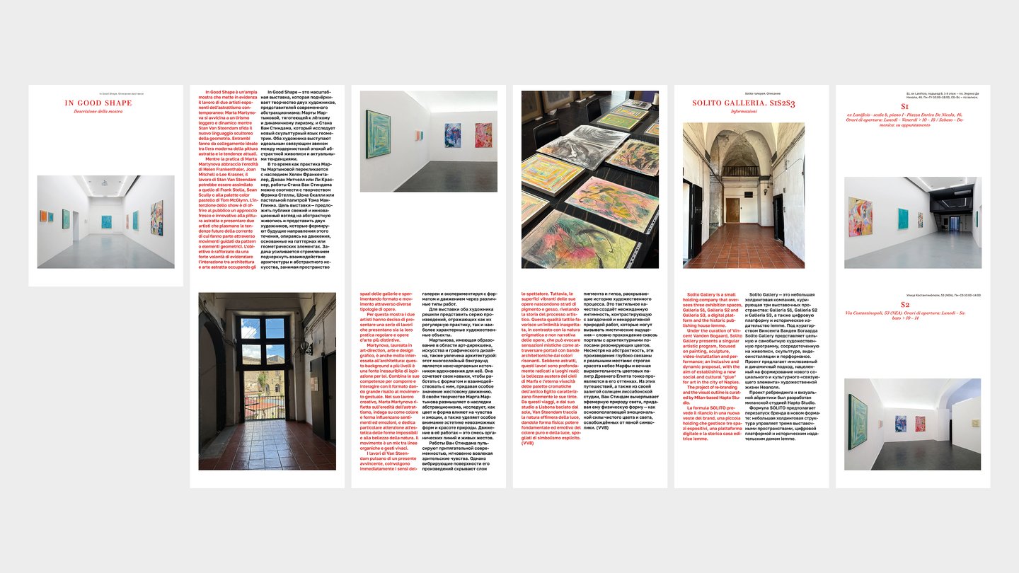 Каталог выставки In Good Shape проводит читателя через миры двух художников, раскрывая их уникальные подходы и художественные образы. Сначала мы знакомимся с каждым автором отдельно, и уже на этом этапе страницы создают ощущение диалога и постепенного слияния их миров. Затем мы погружаемся в саму выставку: работы переплетаются друг с другом, формируя единое целое. Каталог сочетает два языка — русский и итальянский — и сам становится продолжением выставочного пространства.
