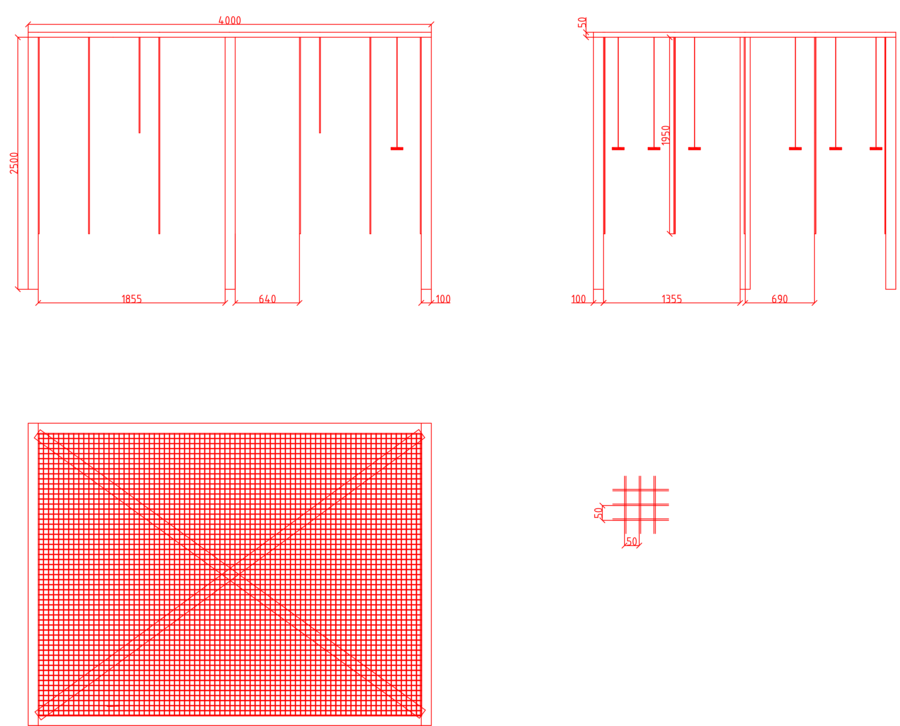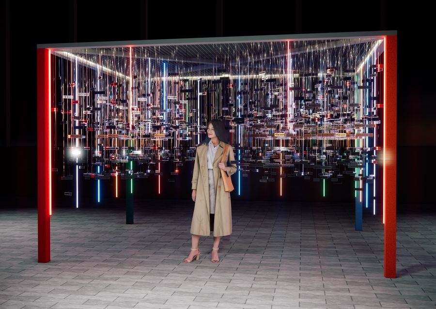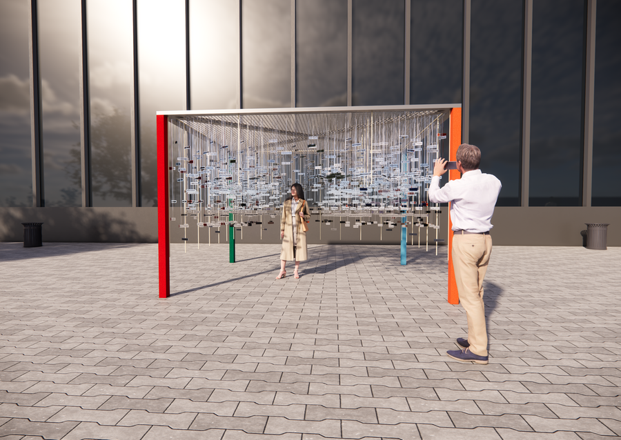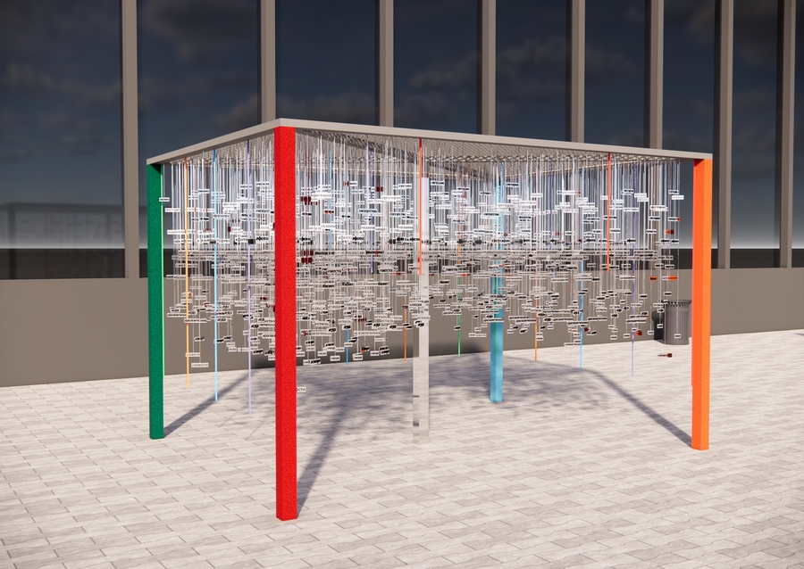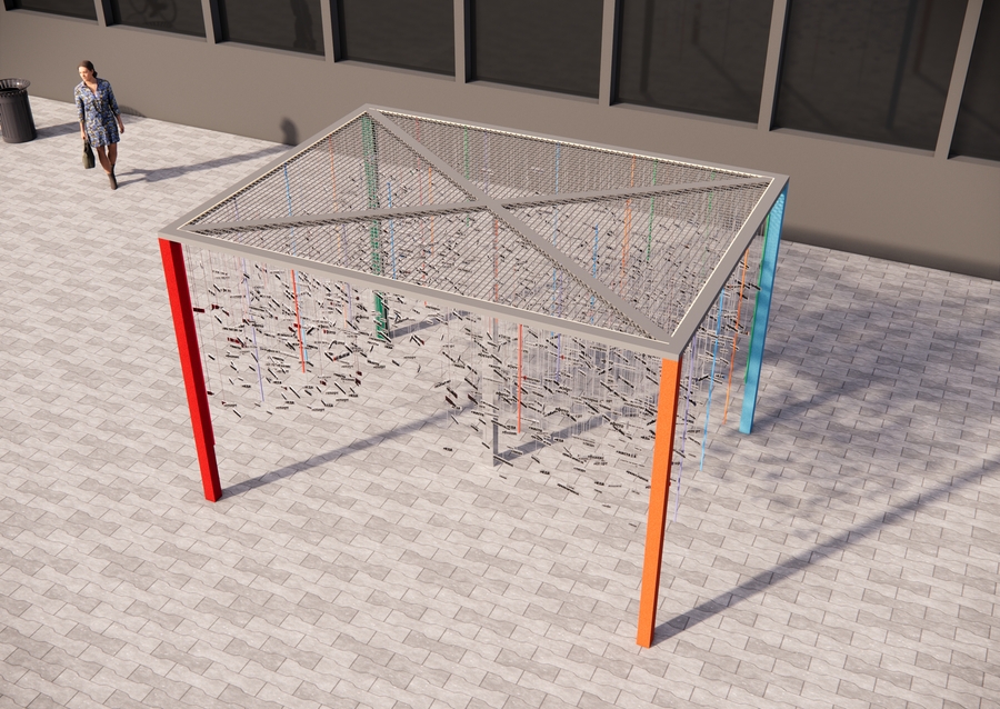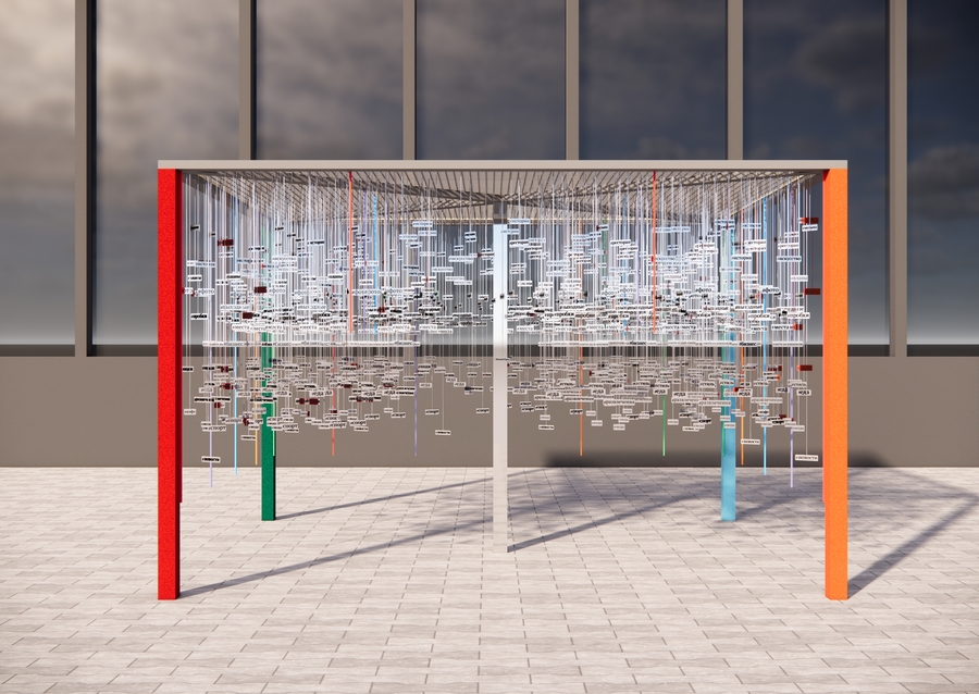 Инсталляция состоит из каркаса из металлопрофилей, прямоугольных световых объектов в брендовых цветах и табличек, подвешенных к оцинкованной металлической сетке.