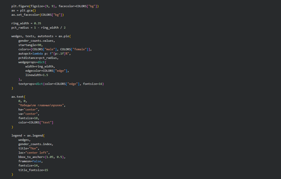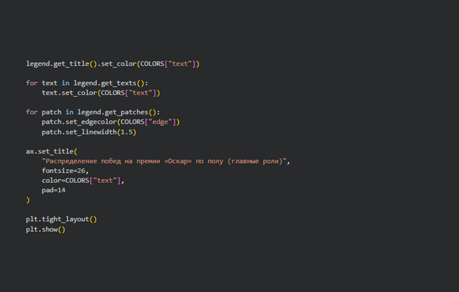 В завершение я решила посмотреть на гендерное распределение побед в главных актёрских категориях. Кольцевая диаграмма демонстрирует почти равный баланс между мужчинами и женщинами, с минимальным перевесом в сторону актрис.