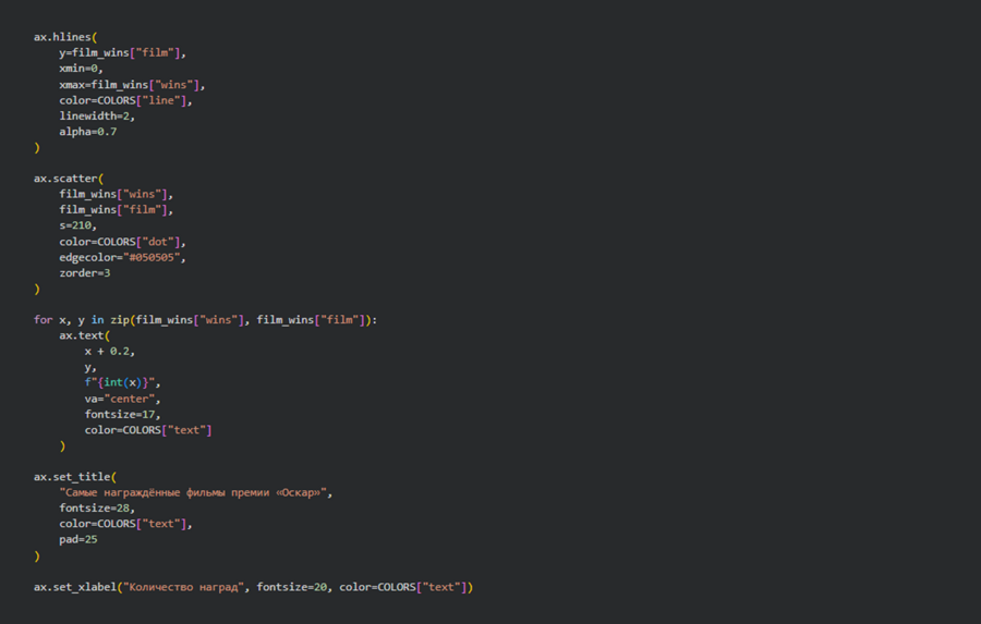 Чтобы разобраться, какие фильмы вошли в историю как рекордсмены, я использовала формат графика, который позволяет легко сравнить картины по количеству полученных наград. Лидером здесь выступает Титаник, за которым следуют Властелин Колец.