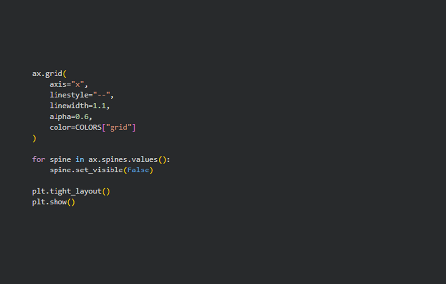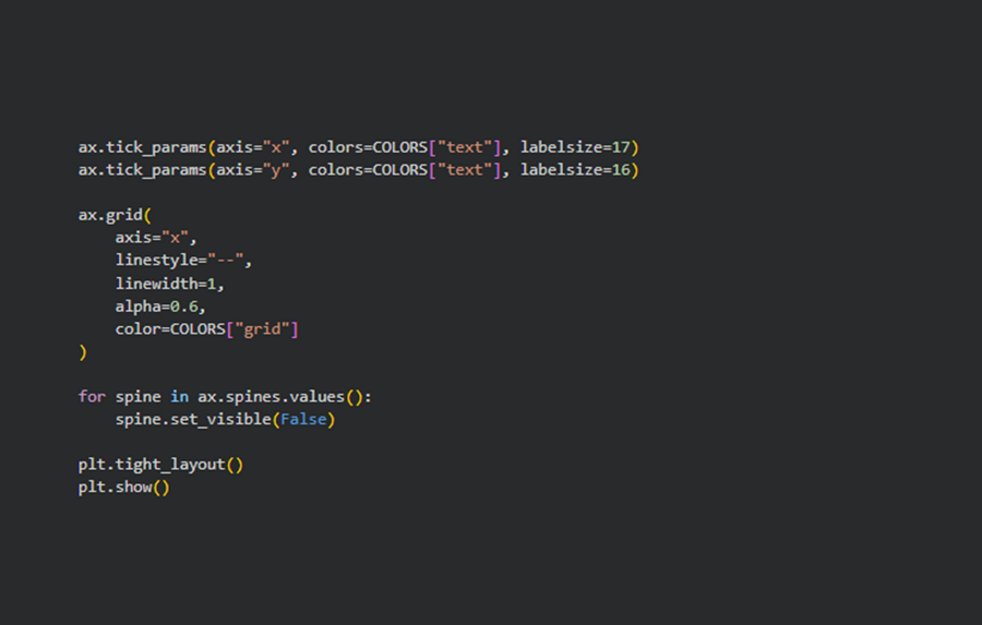Для исследования я выбрала несколько типов визуализаций, каждая из которых помогает взглянуть на данные под разным углом: горизонтальная столбчатая диаграмма, линейный график, lollipop chart и кольцевая диаграмма.